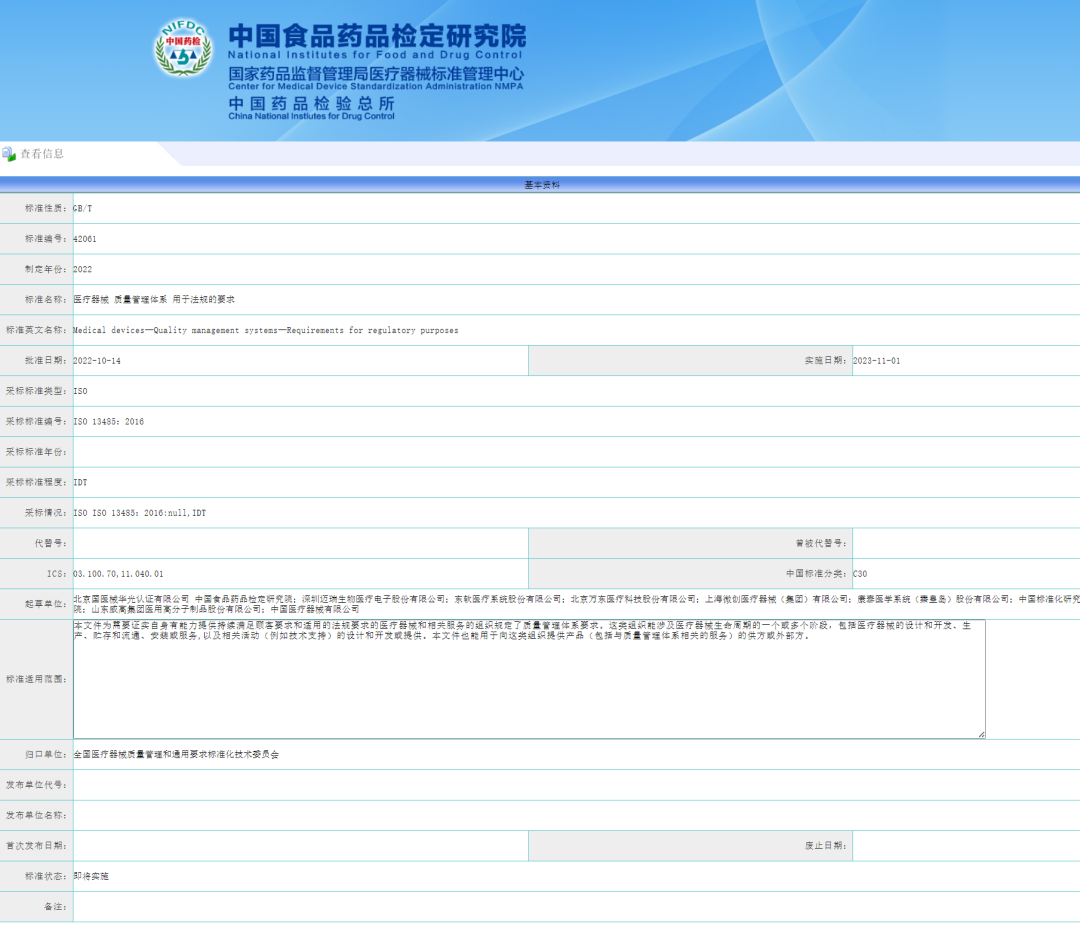 据标管中心网站消息,当前对标ISO 13485:2016的GB/T 42061-2022 医疗器械 质量管理体系 用于法规的要求即将于11月1日起实施: 详细信息 标准适用范围 本文件为需要证实自身有能力提供持续满足顾客要求和适用的法规要求的医疗器械和相关服务的组织规定了质量管理体系要求。这类组织能涉及医疗器械生命周期的一个或多个阶段,包括医疗器械的设计和开发、生产、贮存和流通、安装或服务,以及相关活动(例如技术支持)的设计和开发或提供。本文件也能用于向这类组织提供产品(包括与质量管理体系相关的服务)的供方或外部方。 ISO13485 科普 内容来源:国家认监委 什么是ISO13485标准? ISO13485标准是适用于医疗器械法规环境下的质量管理体系标准,其全称是《医疗器械 质量管理体系 用于法规的要求》。它采用了基于ISO9001标准中PDCA的相关理念,相较ISO9001标准适用于所有类型的组织,ISO13485更具有专业性,重点针对与医疗器械设计开发、生产、贮存和流通、安装、服务和最终停用及处置等相关行业的组织。目前组织可以依据ISO13485:2016版标准建立体系或者寻求认证。 ISO13485:2016标准重点内容 1、本标准以法规要求为主线,强化了企业满足法规要求的主体责任 2、本标准强调基于风险的方法管理过程,强化组织应将基于风险的方法应用于控制质量管理体系所需的适当过程 3、本标准重点强调与监管机构进行沟通和报告的要求 4、本标准在ISO9001的基础上,更加强调形成文件的要求和记录的要求 适用企业类型 ISO13485认证主要涉及的组织类型包括:医疗器械设计和制造商、医疗器械经营商、医疗器械服务提供方、医疗器械软硬件开发商以及医疗器械零部件/材料供应商。 ISO13485认证所适用的相关产品范围 ISO13485认证涉及的相关产品分为7个技术领域: 1、非有源医疗设备 2、有源(非植入)医疗器械 3、有源(植入)医疗器械 4、体外诊断医疗器械 5、对医疗器械的灭菌方法 6、包含/使用特定物质/技术的医疗器械 7、医疗器械有关服务 本月新规汇 截至发文时,本月共有以下这些医械新规发布: 1 可吸收骨内固定植入物注册审查指导原则 第一部分:合成高分子材料(征求意见稿) 2 《医疗器械临床试验质量技术规范》(征求意见稿)及编制说明 3 《体外诊断试剂临床试验质量技术规范》(征求意见稿)及编制说明 4 磁共振成像系统人工智能软件功能审评要点 5 纳米材料类医疗产品分类界定指导原则(征求意见稿)及编制说明 6 组织工程类医疗产品分类界定指导原则(征求意见稿)及编制说明 7 《关于进一步加强医疗器械产品分类界定有关工作的通知》(征求意见稿) 8 医疗器械网络销售质量管理规范(征求意见稿) 9 医疗器械唯一标识的形式和内容征求稿及编制说明 10 医疗器械唯一标识的包装实施和应用征求稿及编制说明 |