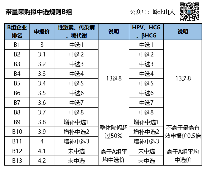 对于B组而言,要遵循三个规则:60%左右的直接入围,不高于最高有效申报价的50%,不高于A组的平均中选价