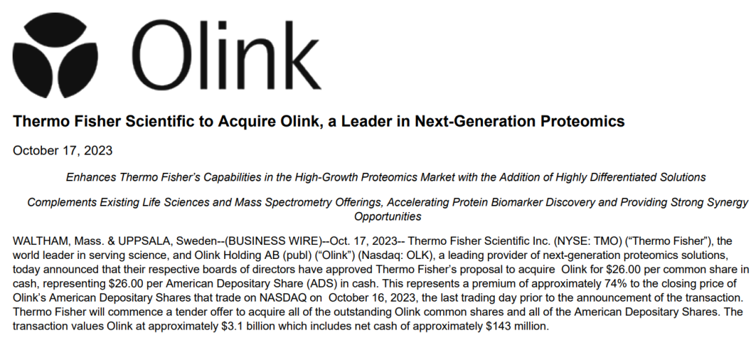 10月17日,赛默飞世尔宣布以31亿美元收购领先的下一代蛋白质组学解决方案提供商Olink,双方董事会已批准该收购。赛默飞世尔以每股普通股26.00美元的现金收购Olink的提议,相当于每股美国存托股26.00美元的现金。这比Olink美国存托股票的上一个交易日收盘价溢价约74%。赛默飞世尔将开始要约收购所有已发行的Olink普通股和所有美国存托股。该交易对Olink的估值约为31亿美元,其中包括约1.43亿美元的净现金。Olink有望在2024年实现超过2亿美元的收入。Olink为高级蛋白质组学的发现和开发提供了领先的解决方案,使生物制药公司和领先的学术研究人员能够快速有效地从蛋白质水平了解疾病。Olink的专有技术,接近延伸分析(PEA),为市场上安装的qPCR和下一代测序读出系统的庞大基础提供高通量蛋白质分析。该技术拥有5300多个经验证的蛋白质生物标志物靶标库,其应用力度非常大,发表了1400多篇科学出版物。Olink总部位于瑞典,业务遍及美洲、欧洲和亚太地区。赛默飞世尔董事长、总裁兼首席执行官Marc N.Casper表示:“收购Olink突显了蛋白质组学对我们的客户继续推进生命科学研究和精准医学的深远影响。Olink经过验证的变革性创新与我们领先的质谱和生命科学平台高度互补。我们公司处于独特的地位,能够将这项技术带给客户,使他们能够有意义地加快发现和科学突破。我们期待着欢迎Olink的同事加入赛默飞世尔。”Olink首席执行官Jon Heimer表示:“Olink致力于通过加快下一代蛋白质组学的使用,并以前所未有的规模提供行业领先的数据质量,来提高对人类生物学的理解。赛默飞世尔深厚的生命科学专业知识、全球影响力和经验证的卓越运营将为客户和同事带来重大机遇,同时也为我们的股东。”该交易预计将于2024年年中完成,受制于惯例的成交条件,包括收到适用的监管批准和完成投标报价。作为交易的一部分,Olink的最大股东Summa Equity AB以及另外的Olink股东和管理层(合计持有Olink 63%以上的普通股)已签订支持协议,同意对收购要约进行投标。赛默飞世尔预计将利用手头现金和债务融资为此次收购提供资金。完工后,Olink将成为赛默飞世尔生命科学解决方案部门的一部分。