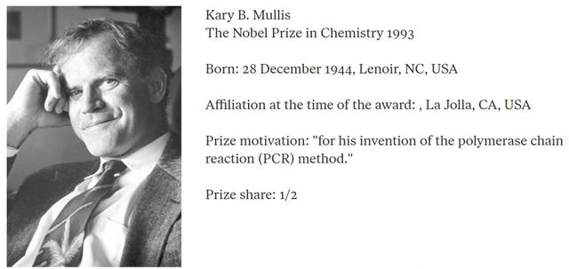 1993 年,凯利·穆利斯因发明聚合酶链锁反应(PCR)而荣获诺贝尔化学奖。