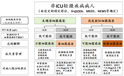 用于呼吸道感染的ABS临床试验的PCT推断 PCT-指导ABS的概念,首先在低呼吸道感染的ED病人进行检测[19]。考虑了在病毒感染的PCT依然很低(未检出)、而在细菌感染中升高,若PCT水平各自为<0.1 μg/L或<0.25 μg/L,研究推断建议,非常强烈或强烈地反对使用抗生素。推断也包括了一些否决的指标,所以,处于非常高风险的病人依然按照经验治疗,除非很低的PCT水平。按此,给出了两个水平的建议,也为PCT高于<0.25 μg/L的病人,开始抗生素治疗建议,以及PCT高于<0.5 μg/L(抗生素强烈地建议)。研究展现了在抗生素使用率上显著的减少,特别对气管炎和COPD加剧的病人。 以后不仅研究了PCT对开始凭经验的抗生素治疗,而且也使用PCT去监视治疗的响应,并在各个病人基础上决定中止抗生素治疗[19,20]。PCT下降低于0.25 μg/L、或从峰值下降至少>80%-90%,被用作停止使用抗生素的规则临界值。这个方式进一步减少了抗生素使用,通过缩短治疗的期限,特别是对CAP病人。以后的一个大型的遍及瑞士的、随机化的、非自卑试验(non-inferiority),发现这个方式在减少抗生素使用超过3天上高度有效,没有增加不利后果的风险[16,21]。 今天,多个类似的试验在不同国家和不同临床情况下实施(即,从初级治疗到急诊部和住院病房,到重诊监视病房)。最近的荟萃分析包括来自12个不同国家的26项随机对照试验的6708名不同类型和严重程度的呼吸道感染病人的各个病人数据,调查了PCT指导的抗生素决策[22,23]在呼吸道感染情况下的效果(与总体情况相比) 数据荟萃分析,病人级别的数据荟萃分析允许按感染类型和临床环境对结果定义和亚组分析进行标准化。该研究表明,在呼吸道感染中使用PCT可以减少抗生素的暴露(抗生素的起始剂量从86%降低到72%,总暴露量从8.1天减少到5.7天),抗生素的副作用(从22.1%降低到16.3%),死亡率显着降低14%(从10%降至8.6%)。结果在不同的临床情况(即初级治疗、ED、或critical care急救护理)、以及感染类型(肺炎、气管炎、COPD加剧)等是一致的。 在临床试验中使用的PCT判断限的第二次分析,揭示了用于开始使用抗生素的主要判断限,适用于病人的严重性。因此,在初级治疗或ED中处于轻微或中度疾病病人,使用了PCT判断限0.25 μg/L,而严重疾病的病人(即,要求入住ICU病房)主要使用判断限为0.5 μg/L[24]。同样,对轻微/中度或严重疾病的,为中止抗生素使用的PCT各自为0.25 μg/L或0.5 μg/L,或PCT显示了从峰值下降≥80%[8]。 *警示内容:对具有免疫抑制(包括HIV)、CF(囊性肺纤维化(cystic pulmonary fibrosis))、胰腺炎、烧伤、大容量输血、疟疾等;以PCT指导的管理不应用于慢性感染(如,脓肿、骨髓炎、心内膜炎)。 图1:非ICU中轻微疾病病人PCT的使用 *警示内容:对具有免疫抑制(包括HIV)、CF(囊性肺纤维化(cystic pulmonary fibrosis))、胰腺炎、烧伤、大容量输血、疟疾等;以PCT指导的管理不应用于慢性感染(如,脓肿、骨髓炎、心内膜炎)。 图2:非ICU中中度疾病病人PCT的使用 *警示内容:对具有免疫抑制(包括HIV)、CF(囊性肺纤维化(cystic pulmonary fibrosis))、胰腺炎、烧伤、大容量输血、疟疾等;以PCT指导的管理不应用于慢性感染(如,脓肿、骨髓炎、心内膜炎)。 图3:对ICU中严重疾病病人PCT的使用 脓毒症中PCT指导ABS的临床试验和推断 使用PCT对个性化抗生素治疗提及的概念,也吸引了ICU脓毒症病人。但是,开始关注的是对最严重病人这个方式的安全,由于太短时间使用抗生素,可能会造成感染复发和较高的死亡率。第一个概念验证研究是对ICU中脓毒症的病人[14],发现减少抗生素暴露,没有以往对后果的负面影响。该试验对脓毒症病人使用了较高PCT判断限(0.5-1 μg/L),也使用了PCT的动态观察(从峰值水平减少到>90%),建议中止抗生素。这个概念以后在多中心、非自卑(non-inferiority)PRORATA试验中[17],PCT在脓毒症病人中使用是充分和安全的。因为ICU的脓毒症病人具有一个先天高风险,治疗时间是决定性的。使用PCT主要为早期中止治疗,但不是为指导经验治疗[25]。这个概念以后也在降钙素原指导中止抗生素(SAPS)研究中检测确认,该研究中的所有具有疑似脓毒症病人开始了抗生素治疗,在PCT水平至少从峰值减少了80%、或PCT将到低于0.5μg/L下中止抗生素。与标准治疗比较,使用PCT可减少抗生素的暴露(抗生素持续从7天到5天),并改善了存活(在1年里6.1%较好的存活)[7]。 一个近期对11个在危急脓毒症疾病病人中以PCT指导ABS的临床试验,进行的病人-水平荟萃分析[26],也发现在2252例PCT-指导病人,较2230例对照组病人的死亡率显著地较低(21.1%yu 23.7%)。这个发现与按照感染类型(呼吸道、尿道、腹部、皮肤或中枢神经系统)、脓毒症-3定义或脓毒症的严重性(由相继器官衰竭评估确定[SOFA]得分、存在脓毒症休克或肾衰、或需要加压或供氧支持)分类的亚组分析一致。研究也揭示了,在脓毒症病人中,PCT使用导至较早中止抗生素、并减少治疗持续从10.4天到9.3天,看来对较少严重脓毒症病人和呼吸道感染病人有较强烈的作用。进一步的荟萃分析也揭示了,存活的好处与仅为抗生素中止的PCT推断有关,而对ICU病人,PCT推断对抗生素开始或混合方式,没有减少死亡率[27]。最后,集中关注具有培养阳性的细菌感染病人的荟萃分析,也发现了对抗生素用法上PCT使用的显著作用,没有不利的临床后果的证据,除了缩短了抗生素的持续使用[28]。