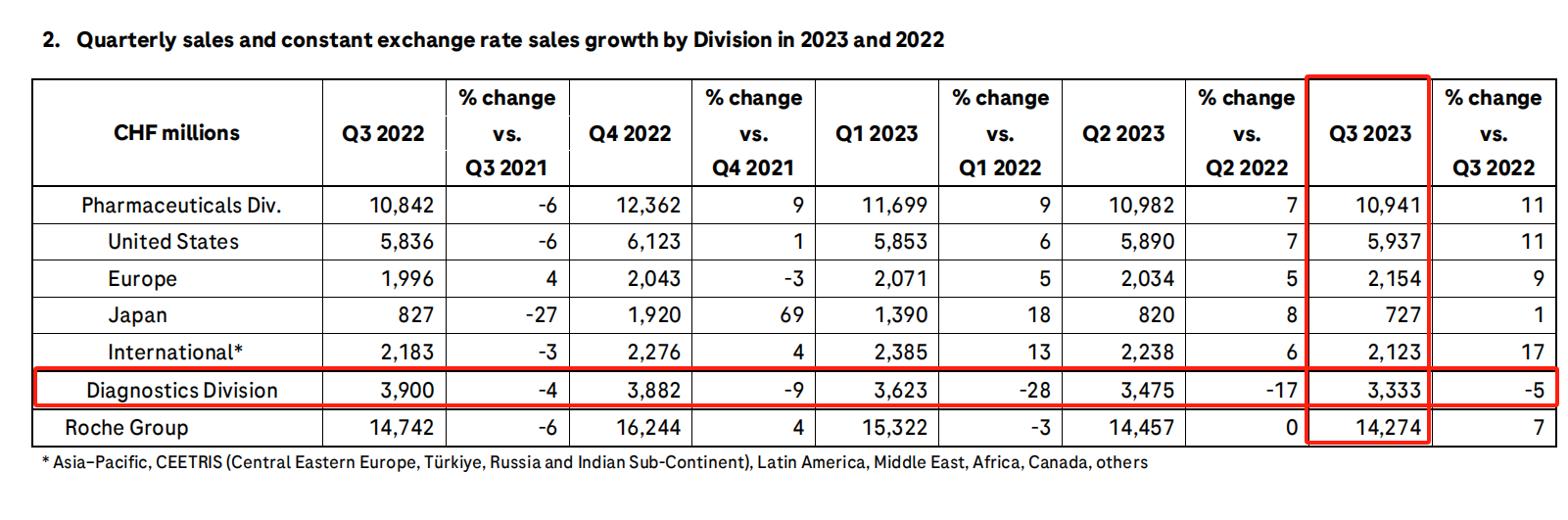 罗氏在Q3的整体营收为142.74亿瑞士法郎,同比+7%,其中:
