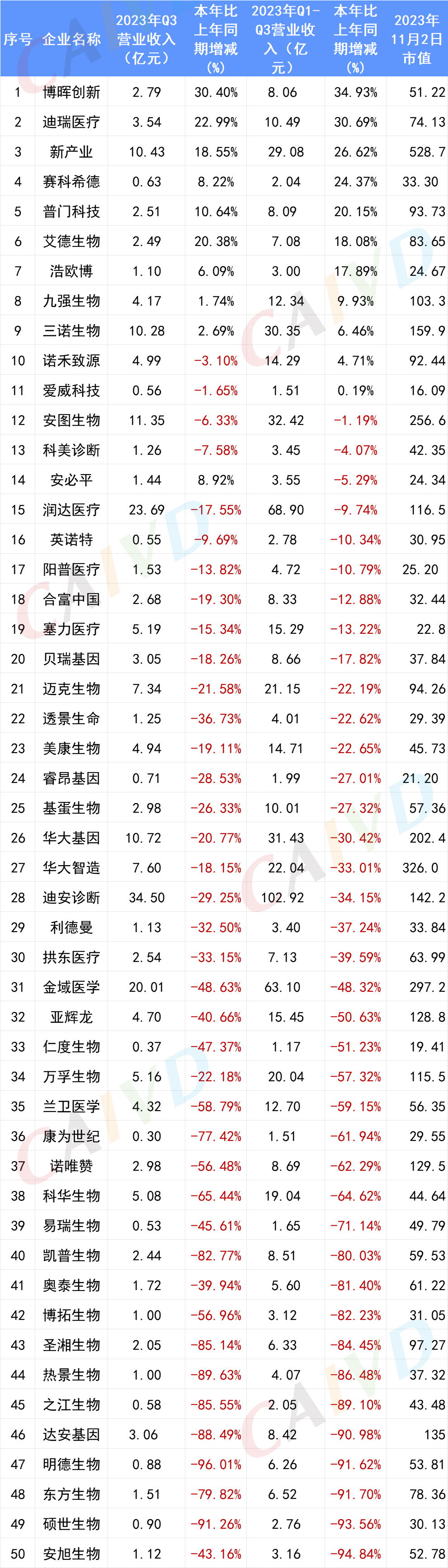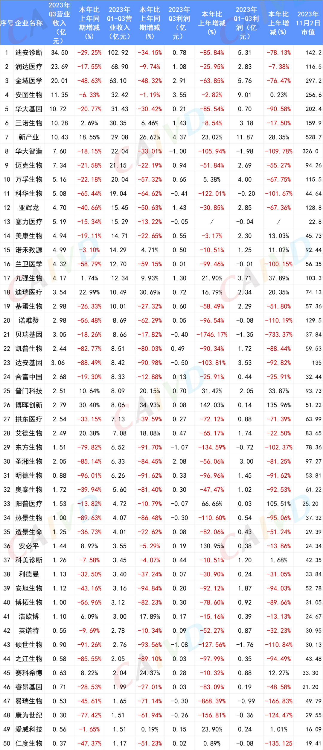 截止2023年10月31日,已有50家IVD上市企业公布了其Q3的财报,从已公布的数据来看,前三季度总营收前十的企业分别为:迪安诊断营收102.92亿元、润达医疗营收68.90亿元、金域医学营收63.10亿元、安图生物营收32.42亿元、华大基因营收31.43亿元、三诺生物营收30.35亿元、新产业营收29.08亿元、华大智造营收22.04亿元、迈克生物营收21.15亿元、万孚生物营收20.04亿元。 前三季度总营收表: 按总营收排名(滑动浏览) 从整体Q3财报数据来看,只有11家企业(22%)的前三季度总营收相较于去年同期增长为正,分别为:博晖创新总营收8.06亿元,同比增加34.93%,迪瑞医疗总营收10.49亿元,同比增加30.69%,新产业总营收29.08亿元,同比增加26.62%,赛科希德总营收2.04亿元,同比增加24.37%,普门科技总营收8.09亿元,同比增加20.15%,艾德生物总营收7.08亿元,同比增加18.08%,浩欧博总营收3.00亿元,同比增加17.89%,九强生物总营收12.34亿元,同比增加9.93%,三诺生物总营收30.35亿元,同比增加6.46%,爱威科技总营收1.51亿元,同比增加0.19%。 前三季度营收表: 按增长率排名 博晖创新、迪瑞医疗、新产业、赛科希德、普门科技、九强生物、诺禾致源、爱威科技无论是前三季度的总营收还是归母净利润都实现了同比正向增长。安图生物、美康生物、阳普医疗、科美诊断虽然营收比去年同期有所下降,但是净利润却实现了正增长。艾德生物、浩欧博、三诺生物前三季度营收实现同比正增长,但是总利润却相较去年同期有所下降。 总利润表 利润表:按利润增长率排名 与体外诊断相关的上市企业前三季度营收情况如下:迈瑞医疗273.04亿元,归母净利润98.34亿元,万泰生物49.69亿元,归母净利润18.08亿元,中源协和12.02亿元,归母净利润1.33亿元,丽珠集团96.55亿元,归母净利润16.02亿元,理邦仪器23.37亿元,归母净利润3.39亿元,天瑞仪器6.16亿元,归母净利润-0.14亿元。 总表(按总营收排序) 注:诺辉健康、艾迪康、巨星医疗、华检医疗、康圣环球、云康集团、中生北控、美因基因、华康生物医学未公布其三季度财报。 供稿、编辑:雪墨 | 校对:甜宝 | 责编:小舟 |