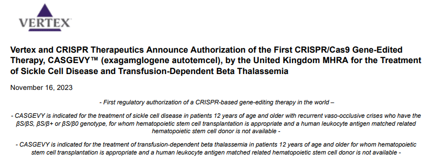 2.https://www.businesswire.com/news/home/20231115290500/en/%C2%A0Vertex-and-CRISPR-Therapeutics-Announce-Authorization-of-the-First-CRISPRCas9-Gene-Edited-Therapy-CASGEVY%E2%84%A2-exagamglogene-autotemcel-by-the-United-Kingdom-MHRA-for-the-Treatment-of-Sickle-Cell-Disease-and-Transfusion-Dependent-Beta-Thalassemia