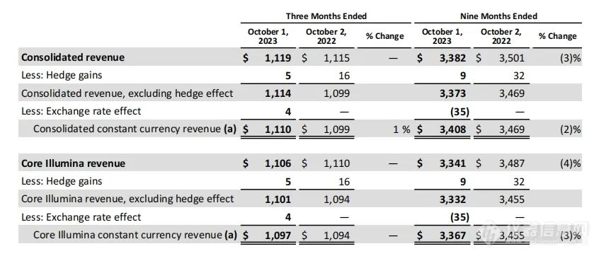 2023年第三季度收入11.2亿美元,同比增长0.36%,非GAAP利润率为66%;第三季度核心收入(不包括GRAIL)11.06亿美元,同比下降0.36%。2023财年第三季度非GAAP净利润5200万美元,同比下降3.7%,GAAP会计准则下亏损达7.45亿美元,包括GRAIL相关的8.21亿美元的无形减值。 2023财年前三季度累计收入33.82亿美元,去年同期累计收入为35.01亿美元,同比下降3.4%。前三季度核心收入(不包括GRAIL)33.41亿美元,同比下降4.19%。(财报特别说明,报告中数据主要是非GAAP业绩,替代或优于按照公认会计准则计算的财务指标。因为在gaap下的财务指标包括大量费用,如收购的无形资产的摊销等。) 分业务看,第三季度: