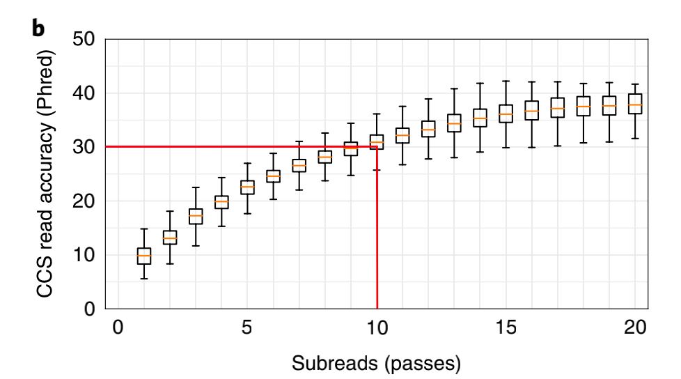 如下图所示,当你有5个“孩子”,能够实现Q20(99%)以上的准确率,而当你有10个“孩子”,即在环状模板上跑10次(10 passes),准确率就能达到Q30(99.9%)。