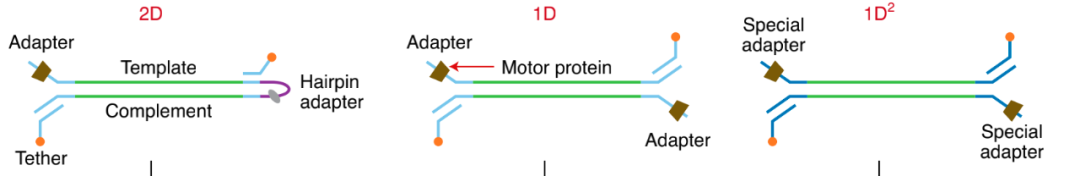 继2D模式后,ONT于2017年推出了1D2测序方法。他们为DNA分子的两条链分别接上一种特殊的接头,该接头大概率能使互补链和模板链被同一个纳米孔所捕获,但不能确保这一事件的发生(概率>60%)。