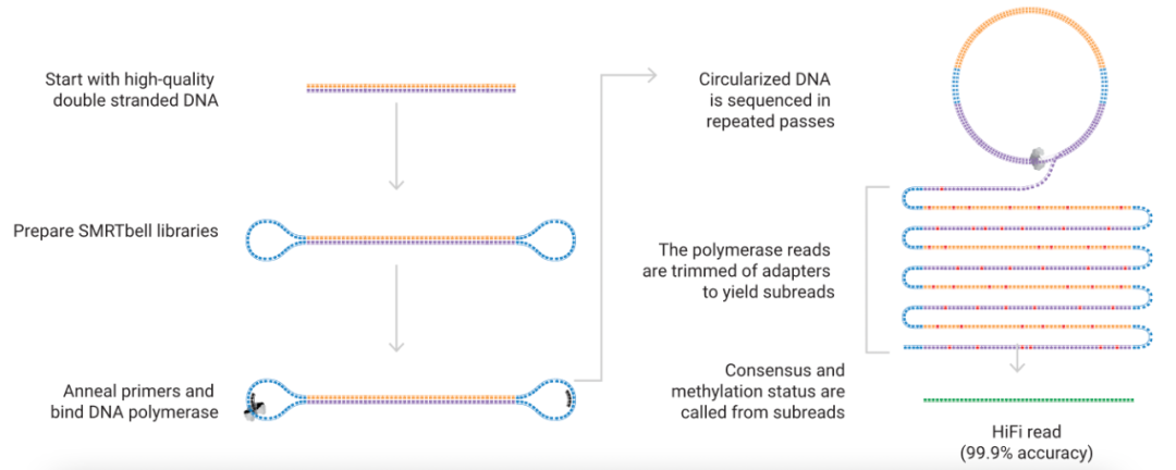 HiFi测序由PacBio公司开发,意思是High-Fidelity(高保真)测序。你可以认为是SMRT测序技术的进阶版。它兼具长读长和高准确率,也是目前正在推广和应用的、最具代表性的版本。