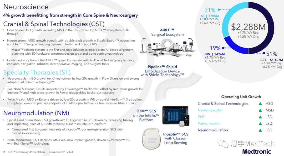 CST:核心脊柱业务实现高个位数增长,其中AiBLE™生态系统的持续推广拉动了植入物的推广。神经外科业务实现中个位数增长,这是因为StealthStation™导航系统和O-arm™成像系统销售强劲。