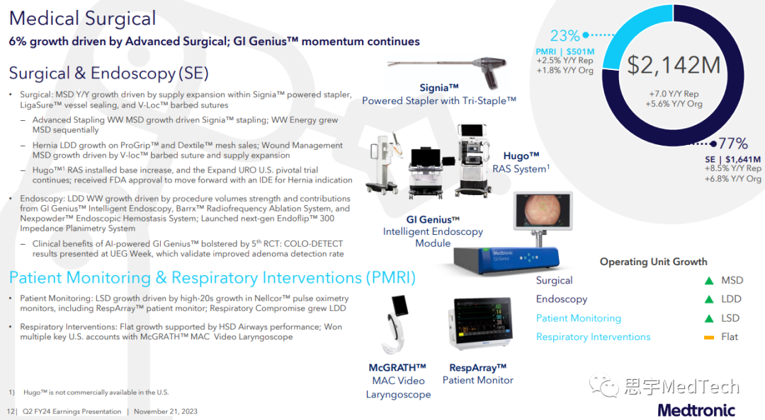 SE:普通外科技术实现低两位数增长,高级外科技术实现中个位数增长,内窥镜业务实现低两位数增长。此外,Hugo™机器人辅助手术(RAS)系统安装基数增长,还获得了FDA的器械临床实验豁免(IDE),开始了在美国临床上用于疝气手术的实验。