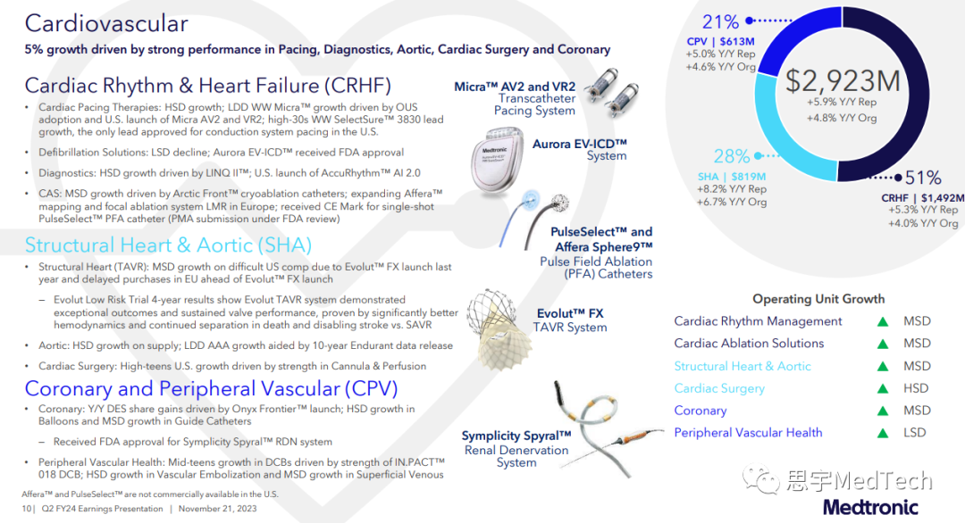 心血管产品组合包括心律和心力衰竭(CRHF)、结构性心脏和主动脉(SHA)以及冠状动脉与外周血管(CPV)部门。