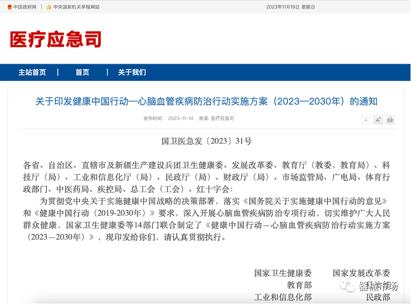 2023年11月15日,国家卫生健康委、国家发展改革委等部门15日发布了心脑血管疾病和癌症防治行动实施方案,其中多项内容将直接影响未来器械市场格局。 我国重大慢性病过早死亡率从2015年的18.5%下降到了2022年的15.2%,此次发布《健康中国行动——心脑血管疾病防治行动的实施方案(2023-2030)》和《健康中国行动——癌症防治行动实施方案(2023-2030)》明确,要从源头入手为癌症和心脑血管疾病的防治提供支持和保障。 《健康中国行动—心脑血管疾病防治行动实施方案(2023—2030年)》国家将心脑血管疾病防治工作纳入《“健康中国2030”规划纲要》《中国防治慢性病中长期规划(2017-2025年)》等重要政策文件,并在《健康中国行动(2019-2030年)》15个专项行动中设立“心脑血管疾病防治行动”。 方案明确,到2030年建立覆盖全国的心脑血管疾病综合防控和早诊早治体系;各级医疗卫生机构的心脑血管疾病防治能力和质量进一步改善,心脑血管疾病防治技术取得较大突破,心脑血管疾病死亡率下降到190.7/10万以下。 此次发布的新版心脑血管疾病防治实施方案明确,要“实施危险因素控制,降低发病和死亡风险”、“强化关口前移,创新心脑血管疾病同防同治路径”。加大基层医疗机构血压、血糖、血脂“三高共管”力度。到2030年,高血压、糖尿病患者基层规范管理服务率均达到70%,治疗率、控制率在2018年基础上持续提高,35岁以上居民年度血脂检测率达到35%。探索将冠心病、脑卒中患者的二级预防和康复治疗纳入家庭医生签约服务范围。新版癌症防治实施方案提出七方面重点工作:控制危险因素,降低癌症患病风险;完善癌症防治服务体系,加强信息共享;推广癌症早诊早治,强化筛查长效机制;规范癌症诊疗,提升管理服务水平;促进中西医结合创新,发挥中医药独特作用;加强救助救治保障,减轻群众就医负担;加快重大科技攻关,推广创新成果转化。具体内容包括:到2030年,所有二级以上医院卒中中心均开展静脉溶栓技术。有条件的地方通过建立胸痛和脑卒中“急救地图”,切实提高救治效率。推动心脑血管疾病相关医疗质控中心地市级全覆盖,并延伸至50%以上县域等。国家卫健委下一步将推进慢性病防治的关口前移和全流程管理,多措并举加强心脑血管疾病综合防治。《健康中国行动—癌症防治行动实施方案(2023—2030年)》