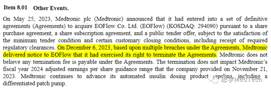 2023年12月6日,美敦力向美国证券交易委员会提交了一份8K报告,声明终止收购胰岛素贴片泵产商EOFlow。