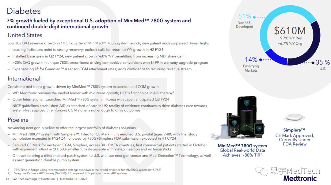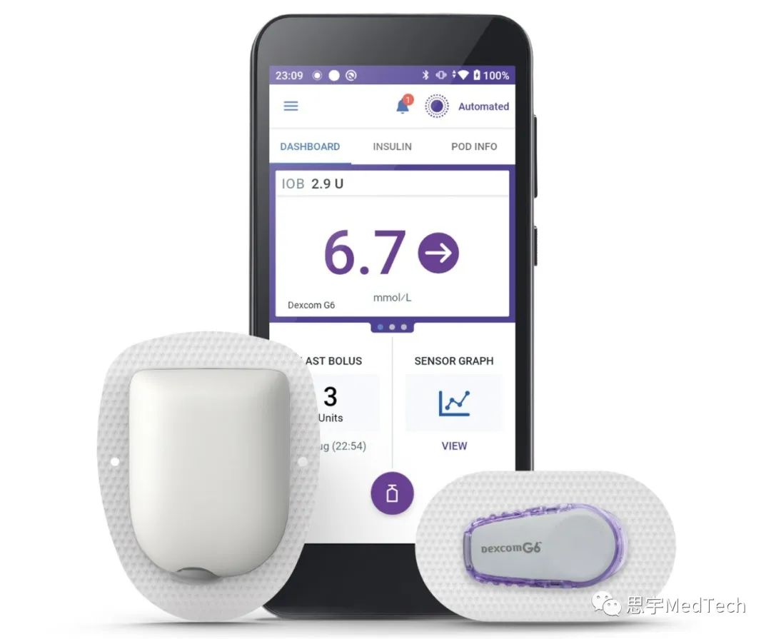 EOPatch的贴片泵相对于Omnipod而言,更薄、更小。该设备还具备防水功能。患者平均3.5天需要更换一次贴片泵(减少了感染的可能),也就是说一周大概要消耗两个贴片泵,此前售价2047人民币一盒(9个),一盒足够患者使用一个月。EOPatch专门的触摸屏控制器类似手机,通过蓝牙与贴片泵连接,屏幕是彩色的,可以储存患者90天的数据。此外,EOPatch还有一个兼容的智能手机应用程序EOBridge,可以让用户直接从手机上监测和控制贴片泵,如查看剩余胰岛素量、设定基础和餐前剂量、查看历史记录等。而OmniPod系统早在2003年就获得了FDA的510(k)许可,其商业版本于2005年获得了FDA的批准,目前已经升级到了Omnipod5(与DexCom建立合作关系后的产物),于2022年8月2日在美国全面上市。这个系统由无管路泵、德康Dexcom G6动态血糖仪和移动应用程序(搭载了SmartAdjustTM人工胰腺-闭环算法系统,可以在手机或提供的遥控器上使用)构成。Omnipod5的贴片泵可以连续佩戴3天(超时8小时内还可以使用,这8小时内每10分钟贴片泵就会发出声音提醒一次),最多可装入200单位的胰岛素。这款贴片泵也防水,防水等级为IP28,经实验认证潜水深度达7.6米时,仍然能正常持续工作60分钟。此外,Omnipod5系统具有SmartBolus计算器,是唯一具有内置计量计算器的自动胰岛素输送系统(AID)。贴片泵会根据Dexcom G6 CGM的葡萄糖读数每5分钟自动增加、减少或暂停胰岛素的推注。美敦力这次选择终止协议,除了怕染上侵权纠纷,可能也源于对于自身糖尿病业务和产品的信心。2023年11月21日,美敦力公布了截至2023年10月27日的2024财年第二季度的财务业绩。报告显示,糖尿病业务第二季度的营收为6.1亿美元,同比增长9.7%,有机增长6.7%。美敦力的糖尿病业务此前因为FDA的一封警告信陷入了长期的困境。2021年12月,FDA指出美敦力的MiniMed 600系列胰岛素泵数千次被报告出现问题,但是美敦力没有对患者的风险进行适当的分类,也没有发起召回,于是发出了一封警告信。美敦力在美的糖尿病相关产品的商业化进程几乎完全被叫停,此后糖尿病业务的业绩靠的基本上就是国际市场。而到了2023年,4月,美敦力宣布FDA解除了对其糖尿病业务总部相关的警告信。同月,美敦力又宣布其配备Guardian 4传感器的MiniMed 780G系统获得了FDA的批准,可以面向7岁及以上的1型糖尿病患者。该批准使其该设备成为唯一具有膳食检测技术的系统,每五分钟可以自动调整和校正血糖水平,以解决用户忘记推注或低估膳食中碳水化合物数量的问题。而到了9月,美敦力的新型一体式、一次性 Simplera™连续血糖监测仪(CGM)又获得了CE认证。此外,美敦力的糖尿病产品管线上还有InPen智能胰岛素笔。目前,美敦力还在研发一款有市场区分度的贴片泵。