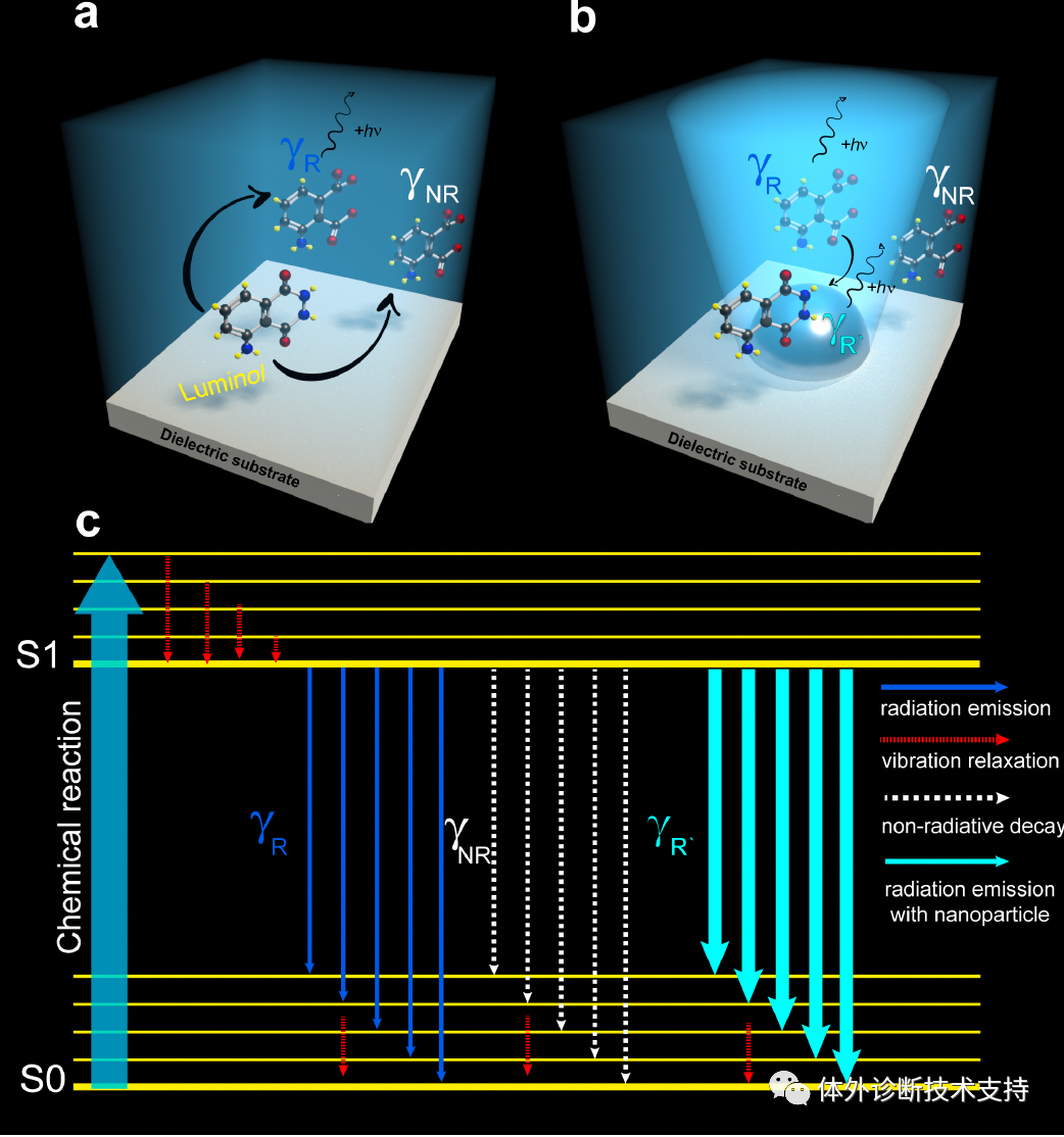 化学发光免疫分析法(chemiluminesecence immunoassay,CLIA)最早出现于上个世纪70 年代中期,因光信号持续时间短、灵敏度较低,并未将其运用于临床检测。 随后国内外研究发现,辣根过氧化物酶、吖啶酯、金刚烷等衍生物和纳米颗粒能增强CLIA 发光强度,随之该方法被发展为一种先进且应用广泛的超微量活性检测方法。CLIA 具有灵敏度高、特异性强、线性范围广、操作简单、成本消耗低、取样少和高通量等特点,现如今在医学领域已经成为重要的检测方法。 化学发光免疫分析法(CLIA)是通过测定特定时刻化学发光的总发光量来确定对应化合物含量的一种分析方法,也是目前较为成熟的免疫分析方法之一,具有高特异性、高灵敏性、试剂稳定以及有限期长、适用面广、所需设备简单、检测范围广、自动化程度高等优点。与现有的酶免法、荧光法检测技术相对比,CLIA 的精准度高出2个或3个数量级。CLIA不需要其他光源,能够高效防止光散射产生的影响,达到更高的信噪比。现今,CLIA多为全自动类型,只需操作者将样品放置仪器上,40min内仪器就能完成定量检测,减少了实验操作不当导至的假阳性结果出现的概率。化学发光免疫分析法常用的发光系统主要为鲁米诺化学发光系统、KMnO4 化学发光系统、光泽精化学发光系统、过氧化草酸酯化学发光系统、四价铈[Ce(IV)]化学发光系统、联吡啶钌(II)发光系统等。这些发光系统均在临床研究、食品安全、兽药残留及环境监测等方面得到了广泛的应用。化学发光免疫分析包含两个部分, 即免疫反应系统和化学发光分析系统。免疫分析是利用抗原与抗体特异性结合形成抗原-抗体复合物而建立起来的一种高选择性的分析方法, 根据其检测方法可分为非标记免疫分析和标记免疫分析。非标记免疫分析是利用抗原与抗体结合形成抗原-抗体复合物后, 其理化性质发生改变,出现肉眼可见的沉淀、凝集等现象, 利用这些现象来检测待检物。标记免疫分析是在不影响抗原、抗体生物活性的基础上将标记物质标记在抗原或抗体上, 然后进行免疫反应形成抗原-抗体复合物, 再对标记物质进行检测, 从而间接检测待检物的方法。目前常用的标记物有放射性的125I , 非放射性的碱性磷酸酶、辣根过氧化物酶, 镧系稀土元素等。化学发光是化学物质在特定化学反应中产生的光辐射。通过高能中间体的分解在化学反应中激发单态分子的形成, 分子被激发后是不稳定的, 它要释放出多余的能量而回到基态, 其中部分的能量以发光形式释放出来。因此, 任何一个化学发光反应包括两个过程:激发和发光过程。①化学反应释放足够的能量, 此过程存在产能效率φc ;②发光物质接收能量, 发生化学结构的改变, 形成激发态中间体, 要求发光物质接收能量的效率比较高(能量传递效率:φe);③激发态中间体通过光的形式释放多余的能量回到基态。激发态回到基态的方式很多, 如磷光,放热等, 所以激发态中间体的荧光效率φf 也需要比较高。整个过程的化学发光效率φcL =φc ×φe ×φf 。