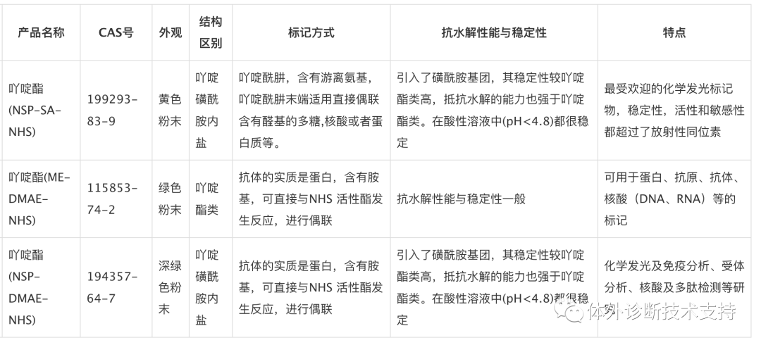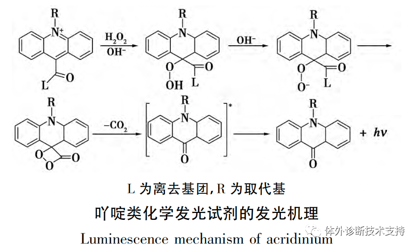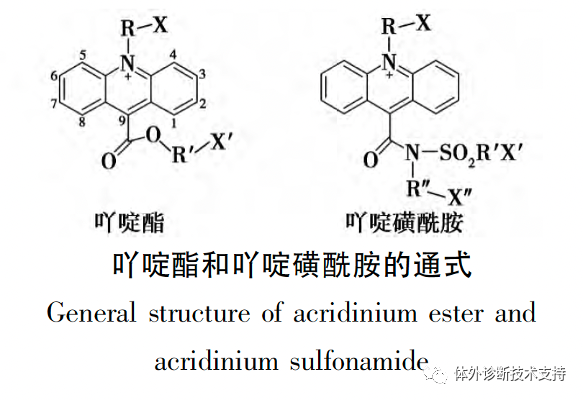 电化学发光免疫分析法(electrochemiluminescence immunoassay, ECLIA)是基于化学环境中光发射原理来检测和分析不同的蛋白质和生物分子,通过化学发光剂三联吡啶钌[Ru(byp)2+3]标记抗原或抗体,同时以三丙胺(tripropylamine, TPA)作为电子供体,经过电场中的电子传递作用,使其产生化学发光的检测方法。ECLIA 具有许多优点,与化学发光(chemiluminescence,CL)法相比,ECLIA 更具选择性,可以通过改变电极电位来选择性地控制激发态的产生;与光致发光(photoluminescence,PL)法相比,ECLIA 不需要光源,能有效降低光散射及发光杂质等问题;与电化学方法相比,ECLIA 具有较高的选择性和较少的电极结垢等优势[8]。而在临床检测中,由于电化学活性材料的干扰以及被吸附蛋白膜污染等因素,也会影响到检测结果。ECLIA 非常适用于小剂量样品的检测,不容易受样品中存在的溶血或浑浊沉淀物的干扰,易实现自动化。鲁米诺(Luminol)其结构简单、易于合成、性质稳定、无毒、环境友好、水溶性好,是应用最多的化学发光试剂之一。CAS号: 521-31-3 鲁米诺Luminol鲁米诺的化学发光性质最早于1928年被 Albrechi HO发现,他发现鲁米诺在碱性溶液中,加入过氧化氢可观测到微弱的发光现象,在此基础上加入适当的氧化剂和催化剂,可以大大提高其化学发光强度。过氧化氢酶、辣根过氧化酶、铁盐、锰盐、过渡金属离子、氨基配合物等均可以作为催化剂或氧化剂增强鲁米诺的化学发光,因此,根据化学发光检测分析的原理,由于上述物质影响了鲁米诺的化学发光速率,并进而影响其化学发光强度,使得鲁米诺可以用于上述物质的分析检测。鲁米诺、异鲁米诺(lsolumino1)及其衍生物是最早在CLIA 中使用的一种常用的化学发光物质。鲁米诺类物质的发光为氧化反应发光。在碱性溶液中, 鲁米诺可被许多氧化剂氧化而发光, 其中H2O2 最为常用。早期的鲁米诺体系主要用于无机物、有机生物小分子的测定, 但由于标记后发光强度降低而使其灵敏度受到影响。20 世纪80 年代, 人们发现发光体系中加入某些酚类及其衍生物、胺类及衍生物及苯基硼酸衍生物对该体系的发光有显著作用, 在这些称作增强剂的物质作用下, 鲁米诺的发光强度可被提高1000倍, 并且氧化剂与发光剂等单独作用时出现的“本底”发光显著降低, 发光时间也得到延长。这些增强剂的使用使得该体系在蛋白、核酸分析领域得到广泛的应用。鲁米诺的化学发光机理通常被认为已经被研究得比较透彻,但实际上,其被氧化中间产物还没有得到统一的结论,只是确定了其最终发光的物质为氨基邻苯二甲酸盐离子。鲁米诺的化学发光机理如图所示。常见的鲁米诺发光试剂包括有异鲁米诺异硫氰酸酯(ILITC)、N-( 4-氨基丁基) -N-乙基异鲁米诺(ABEI )以及4,5-二氨基邻苯二酰肼(DPH)等已经应用于很多领域。因为含有鲁米诺部分的发光试剂发光强度低而且合成困难,所以相关新型衍生物的报道不太多。而近几年该类新型衍生物发光试剂的研究趋势主要有两种:一种是在原有发光试剂的基础上进行相关的结构改造,以发现更优越的发光试剂。Palmioli 以ABEI 为基础进行结构改造,合成了一个呈大环内酯结构的新型异鲁米诺发光试剂ABEI 大环内酯(1) 。对比一般的等价试剂,发光试剂1具有更好的稳定性和反应性,而且合成路线简单高效。另一种是将不同的芳香环引入鲁米诺的氨基位置上,增加其化学发光强度进而获得新型鲁米诺衍生物。Deshmukh合成了含有羟苯基苯并咪唑部分的鲁米诺衍生物(系列化合物2、3) ,研究者另两篇文章又报道了含有苯并吡嗪或单偶氮单元的新型化合物(系列化合物4-7)。同时还研究了这些衍生物在过氧化氢、氰铁化钾及氢氧化钠溶液里面的化学发光特性,发现新型衍生物优于标准的鲁米诺和异鲁米诺体系。预测这些衍生物很有可能会是化学发光探针的候选者。4.2 吖啶酯类(actidinium ester)吖啶酯是一类重要的化学发光试剂,具有较高的量子产率,其化学发光效率较高,通常是鲁米诺的五倍或五倍以上。除此之外,吖啶酯的化学发光过程反应迅速,本底低,在氢氧化钠和过氧化氢的存在下即可发光。在氧化反应过程中,结合物被分解,不影响游离吖啶酯的发光;另外,吖啶酯类化学发光试剂具有较好的稳定性,易于储存。吖啶类是一种量子产率非常高的化学发光试剂,其分子结构至少由两部分组成: 发光基团(emitter) 和离去基团(leaving group) 。应用最广泛的是吖啶酯和吖啶磺酰胺,图中R、R'、R″为烷基、烷氧基及芳基等其他取代基; X、X'、X″为偶联基团,用于偶联抗原或抗体,并增加化合物溶解性取代基 R1、R2、R′、R′′的吸电子或供电子性以及它们的体积会影响过氧化氢阴离子HO2−亲核进攻吖啶酯9位羰基的能力,进一步影响吖啶酯的化学发光动力学,量子产率和其它方面的性质。取代基 R1的电性是化学发光动力学的决定性因素,例如离去基团上无取代基时(R1=H),化学发光过程持续约 1秒左右;由 2′5-二甲基,或 2′6 二甲基取代时,化学发光过程持续约 3 秒左右,被延缓;当离去基团上由 2′6 二溴取代时化学发光过程被加快,约 0.7 秒完成;当离去基团上有 2′6 二硝基或三氟甲基取代时,由于吸电子性更强,发光过程更快,约0.5 秒完成。取代基的位置还会影响吖啶酯的水解稳定性,2′6 位取代基由于引起位阻效应而使吖啶酯稳定性增强,可以预见体积较大的取代基引起较强的空间位阻