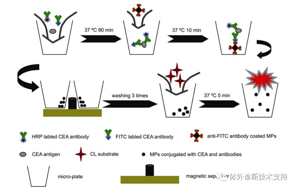 根据化学发光体系中发光剂的不同,可将该方法大致分为三类:直接化学发光免疫分析法、化学发光酶免疫分析法和电化学发光免疫分析法。直接化学发光免疫分析法是利用化学发光标记物对抗体或抗原标记的一种新型检测手段。目前常用的化学发光标记物有鲁米诺类和吖啶酯类,鲁米诺类的标记物不宜直接进行标记,需利用某些化合物对鲁米诺的增强或抑制作用进行直接测定。直接化学发光免疫分析法具有以下优势:背景发光值低、发光反应中干扰因素少、易与蛋白质联结且光子产率不变及标记物稳定。但是,该方法的灵敏度比酶促反应稍低,且发光的持续时间较短。因此,检测过程中对小分子抗原的检测多采用竞争方法,而对大分子抗原的检测多采用夹心法,目前在免疫测定中得到了广泛的应用。化学发光酶免疫分析法(chemiluminescent enzyme immunoassay, CLEIA)是一种通过抗原或抗体上标记的酶与发光底物相互作用产生光子信号的检测方法。通常辣根过氧化物酶(horseradish peroxidase, HRP)与碱性磷酸酶(alkaline phosphatase, AP)是CLEIA方法中最常见的两种酶标记物。它们分别有相对应的发光底物,HRP 发光底物常选择鲁米诺而AP 则选用AMPPD。CLEIA 的优点为:灵敏度高,酶标记抗原或抗体结合稳定,发光持续时间长,便于记录和测定;缺点在于反应速度慢,表面积低、酶容纳量小。但随着纳米材料和催化剂的应用,扩大了固相载体的表面容积,从而提高蛋白与酶的结合量,实现信号放大,提高了CLEIA 的灵敏度和检测效率。实际检测中,CLEIA适合对大量复杂样品进行检测,但也存在样品需求量大、试剂成本高等问题。