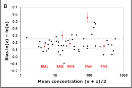 IFCC互换性工作组对参考物质评估的实验要求 互换性评估方案对涉及互换性评估中的每个参与者,都做了明确的要求和规定。不能因为参与实验人员的水平问题严重影响最后的结果。参考物质为RM(Reference Materials);临床样品为CS(Clinical Samples);比对的方法为MP(Measurement Procedure);比对的检测系统MS(Measurement Systems);文章中将方法学一样的任何检测系统都视为一个MP。 1、 互换性的定义 VIM定义的互换性为:某个RM(参考物质)的性质,按照2个给定的MP(检测程序,即超过使用的检测方法或系统)得到了在这个物质内某个规定量的检测结果的关系、以及对其他特定物质检测结果间得到的关系间的一致性。对于医学实验室,其他特定物质是CS(临床样品),预期用于检测,量值通常为被测量。CS可能来自健康的志愿者、或有病的患者。一个RM互换性的定义关注2个MP。 IFCC关注的处理过物质指的是:参考物质、正确度控制品、和能力验证的调查样品。没有一个关心的处理过样品,是我们常规实验室每天遇到的。 2、互换性的评估 互换性的评估要求以下步骤:(a)得到被评价的RM;(b)得到代表性的CS(临床样品);(c)在互换性评估中使用MP检测RM和CS;(d)应用某个程序评价RM结果的互换性,即与CS结果的关系。近期可用的程序,去评估互换性使用的指标,仅依据在2个MP间CS结果差异在统计上的分布;这样,该指标会随着不同精密度性能的MP的不同组合有差异。互换性评估的指标应对所有评估中的MP是一样的,应依据在RM和CS间对使用实验室检测结果确定的医学决定差异的影响。在部分2和部分3的统计方法,展现了互换性评估程序,可以依据在RM和CS间结果上医学关联的差异为依据的指标(1,2)。(注:这里,IFCC对互换性评估方案的第一个严格要求:即互换性评估的指标应对所有评估中的PM是一样的,应依据在RM和CS间对使用实验室检测结果确定的医学决定差异的影响。) 这是IFCC互换性方案与美国EP-30方案完全不同的!也即千万不可将评估方案实验结果,仅仅进行回归处理,以形成回归线的所有实验点的95%分布范围,作为互换性评估可接受的简单处理。在IFCC方案中明确规定,必须以实验检测结果对医学决定影响,作为确定互换性判断指标! 即RM互换性最大的允许偏移,被考虑足以满足它的预期用途的医学性能要求。这样的要求才可从互换性评估实验方案中予以考核。这是在RM和CS间结果上医学关联的差异为依据的指标。 依据部分2方式的互换性评估示例,见图1。一组CS和5个候选的RM显示了2对MP间的偏移(x和y;x和z)。相对偏移在整个CS的浓度区间内是恒定的;结果,CS的平均偏移适合评估在检查的每个RM浓度。每个RM的误差范围(即重复检测所有结果的分布)指示了RM间偏移和CS平均偏移的差异的不确定度。不确定度组成了2个成分:CS偏移的估计的不确定度,和每个RM偏移估计的不确定度。 图1中蓝色虚线指示了预定的RM互换性最大的允许偏移,被考虑足以满足它的预期用途的医学性能要求。指标与检查用的所有对MP相同。在包括在误差bar条RM的偏移完全在蓝色虚线内时,则某RM是可互换的。在图1A中,RM1、RM3和RM5与CS是可互换的,因为它们的偏移,包括误差条,在蓝色虚线之内。但RM2和RM4与CS不是可互换的,因为误差条完全在蓝色虚线之外。在图1B,指标相同,因为依据医学使用要求。但是在CS结果上离散得多,说明MP z具有很大的随机误差成分。增大的离散反映在很大的误差条上,现在使得RM1、RM2和RM5的互换性不确定,因为误差条超出了蓝色虚线。互换性评估展现在图1的示例,反映了CS和MP的数据,qualify被包括在以下章节中叙述的评估。 图1、显示了一组CS(黑菱形)和5个候选RM(红方块)相对于每个MP检测的平均浓度在两个检测系统间浓度转换[ln(浓度)]的偏移。 每个RM的误差条(即所有检测结果的分布)指示了在每个RM和CS平均偏移间差异的不确定度。ln-转换结果的偏移值可以乘上100给出一个大致的百分偏移。黑色直线是所有CS的平均偏移(18%)。蓝色虚线指示了对RM被考虑与CS可互换的最大允许关联互换性偏移。(A)显示了2个MP(x和y)的结果,因MP的随机误差和样品特异的影响reasonably相当地小。(B)显示了2个MP(x和z)的结果,其CS结果较离散,建议MP z具有交叉的精密度,和/或在与MP x上有较大的样品特异影响。 转载请注明出处 微信公众号:冯仁丰 |