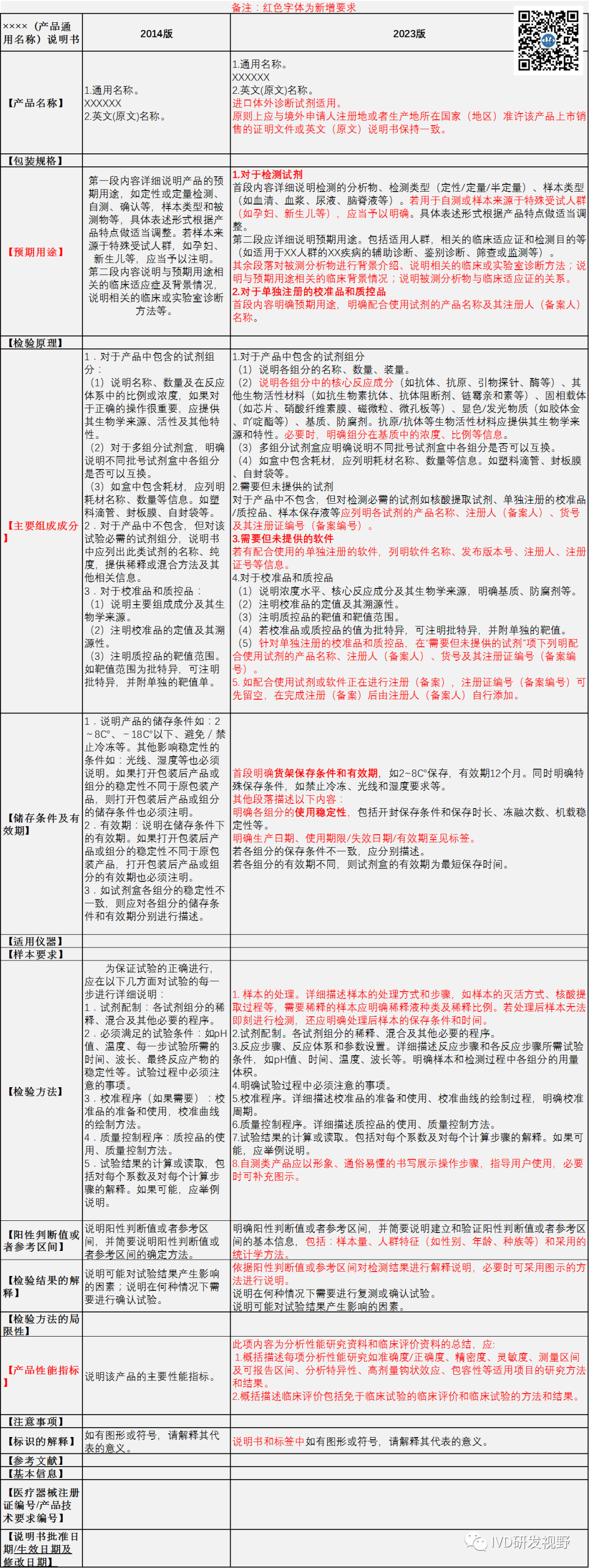 1.前言体外诊断试剂使用说明书(Instruction For Use,简称IFU)是一个产品的核心和必要组分,向终端用户提供产品的基本信息、厂家基本信息、预期用途、正确使用方法以及使用注意事项等。使用说明书的形式可以是纸质的,因我们生活在一个数字化的时代,在许多情况下,提供纸质IFU不是最佳选择,取而代之的是电子使用说明书。不管纸质还是电子形式的说明书,格式和内容要求是一样的。《体外诊断试剂说明书编写指导原则》详细规定了说明书的格式和内容。《体外诊断试剂说明书编写指导原则》从2007版本→2014版本→2023版本,经历了2次修订。2.最新2023版本修订2.1说明书格式2023版本的说明书格式和2014版本基本没有变化,仅是文字表述的小变化。 【医疗器械备案凭证编号/产品技术要求编号】→【医疗器械备案编号/产品技术要求编号】【说明书核准及修改日期】→【说明书批准日期/生效日期及修改日期】 2.2说明书内容一、对校准品质控品的【预期用途】、【主要组成成分】要求进行了详细规定,要求明配合使用试剂的产品名称、注册人(备案人)、货号及其注册证编号(备案编号)。如配合使用试剂或软件正在进行注册(备案),注册证编号(备案编号)可先留空,在完成注册(备案)后由注册人(备案人)自行添加。上述变化主要是监管当局结合近些年的审评经验,发现越来越多的企业基于商业便捷性和可操作性考虑,会选择单独注册申报校准品和质控品,当试剂和校准品/质控品分开进行注册申报时,若无法进行有效的关联,便会存在脱钩现象。因此,需在检测试剂、校准品和质控品各自的说明书中明确配套使用的其他试剂及其注册证号(备案号)和货号,固定检测系统,为使用人员提供参考。二、对试剂的【产品性能指标】要求进行详细规定,要求此项内容为分析性能研究资料和临床评价资料的总结,应: ①概括描述每项分析性能研究如准确度/正确度、精密度、灵敏度、测量区间及可报告区间、分析特异性、高剂量钩状效应、包容性等适用项目的研究方法和结果。 ②概括描述临床评价包括免于临床试验的临床评价和临床试验的方法和结果。 上述变化主要是监管当局考虑随着各类性能评估指导原则和标准的发布实施,体外诊断试剂的评价指标逐渐完善。以往多数申请人提交的说明书中【产品性能指标】过于简单,只是技术要求性能指标,对此,说明书编写指导原则应针对【产品性能指标】项下的书写内容予以丰富和明确。【产品性能指标】内容的丰富,使国内体外诊断试剂说明书的要求更接近于进口产品,进口产品在【产品性能指标】这一模块的内容占据了说明书的1/3篇幅。3.新2023版本与2014版对比以下图表是2023版与2014版的对比,除了上述主要内容的变化,在一些文字表述和细节方面作了调整和补充。