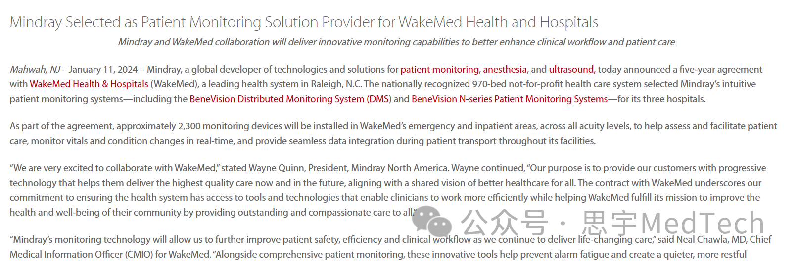 得益于智能化和信息化的设计,BeneVision n系列监护解决方案能够为危重症科室优化工作流程,提升医护人员的工作效率。诊断级的生理参数,智能化的决策辅助,使“诊”和“疗”的信息更加同步,从而让护士与医生能够“以病患为中心”高效协同行动。 迈瑞的BeneVision DMS是一种功能强大且可扩展的解决方案,可在大型和小型医疗保健网络中提供连续、实时的访问和监控。其可集成并显示来自联网床边监视器、生命体征监视器、无线传输解决方案和遥测发射器的患者信息,支持连接至多1200台本地或远程设备。通过定制的架构,BeneVision DMS可以满足医院内部的各种需求,从小型观察单元到联合重症监护单元,再到大型集中监控环境。BeneVision DMS使临床医生能够观察、管理和记录患者的病情,以支持从入院到出院的高质量、以患者为中心的护理。WakeMed首席医疗信息官(CMIO) Neal Chawla医学博士说:“迈瑞的监测技术将使我们在继续提供改变生命的护理的同时,进一步提高患者的安全性、效率和临床工作流程。“除了全面的病人监测,这些创新的工具有助于防止报警疲劳,为病人创造一个更安静、更宁静的环境——这是促进康复的关键因素。” 迈瑞北美总裁Wayne Quinn表示:“我们非常高兴与WakeMed合作。我们的目标是为客户提供先进的技术,帮助他们在现在和未来提供最高质量的护理,与为所有人提供更好的医疗保健的共同愿景保持一致。与WakeMed的合同强调了我们的承诺,即确保卫生系统能够获得工具和技术,使临床医生能够更有效地工作,同时帮助WakeMed履行其使命,通过向所有人提供卓越和富有同情心的护理来改善社区的健康和福祉。”迈瑞成立于1991年,是全球领先的医疗设备开发商、制造商和供应商。公司提供三个核心业务的解决方案:患者监测和生命支持,医学成像和体外诊断。公司总部位于中国深圳,在全球拥有40家子公司,约有10,000名员工和8个全球研发中心。2008年,迈瑞收购了Datascope的患者监护业务,该业务在手术室、紧急护理和重症护理环境中提供了50多年的各种患者监护仪。通过此次收购,迈瑞已成为北美和全球患者监护市场的第三大参与者,也是麻醉系统的第三大供应商。 目前,迈瑞的产品及解决方案已应用于全球190多个国家和地区。在国内市场,迈瑞产品覆盖中国近11万家医疗机构和99%以上的三甲医院。迈瑞医疗已与美国四大集团采购机构合作,直销产品已进入美国医院2/3,监护仪、麻醉机、POC超声市场占有率位居前列。# 关于WakeMed Health & Hospitals WakeMed是一家位于美国北卡罗来纳州的非营利性医疗保健系统,自1961年以来一直服务于社区。WakeMed的存在是为了通过为所有人提供卓越和富有同情心的护理来改善社区的健康和福祉。WakeMed的团队包括10,300多名员工,1,400名志愿者和1,300名附属医生,以及700多名WakeMed医生诊所的医生和提供者。WakeMed的970张床位系统包括整个三角地区的设施网络,包括三家全方位服务医院,七家急诊科,一家专门的儿童医院和康复医院,90多家医生办公室和Wake县唯一的一级创伤中心。
