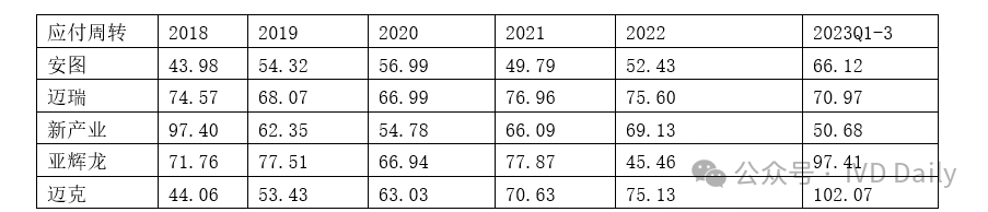 公司经营状况分析 1.盈利能力 1)毛利率对比情况 (1)行业毛利对比情况 新产业毛利最好,迈瑞次之,再分别是安图、亚辉龙,迈克。 (2)试剂机器毛利率拆解 新产业的毛利率试剂稳定在90,安图只有66,主要的原因在于,第一安图还有部分的生化试剂,这部分毛利低,拉低了毛利率。第二加上给经销商的折扣较大,导至毛利率较低。第三是产品的结构不同,导至加价率不同,整体新产业毛利拉安图较大。 (3)安图毛利按照产品结构拆解 新产业的毛利较安图高的原因是因为新产业的经销商的依赖程度低,采取的策略是国内经销模式为:通过公司自身的营销团队在各地目标医疗机构推广产品获取订单并提供售后服务,公司协助经销商进一步开拓市场及维护客户。(这种方式更加切合集采的新形势) (4)按照经销直销方式拆解 直销毛利较低,主要是部分代理产品走直销模式,拉低了毛利率。 (5)季度毛利变化的情况 可以看到安图生物的毛利率逐季向好,主要的原因是磁微粒产品的占比不断扩大,23年Q3已经达到45%,相比22年Q3提升了6个百分点。迈瑞保持稳定,新产业也有小幅提升。 2)净利率对比情况 (1)净利率对比情况 从净利率的情况来看,安图在第一梯队中是最差的,但是远远好于亚辉龙和迈克生物。对比安图与新产业,可拆分毛利影响与费用影响。 净利差距大的原因在于毛利影响与费用影响。安图的毛利率影响差距在较少,费用差距也逐渐的减少。 (2)净利率的季度情况 从季度的情况来看,安图在一季度四季度的净利都较差。新产业则没有明显的季节性且较好。 3)ROE\ROA情况 迈瑞表现最好,新产业次之。迈瑞的利润基本都拿来分红,维持性资本很低,安图账上理财30多亿,还有10多亿的现金,拉低了净资产收益率。 IVD是典型的高利润率、高周转的企业,和白酒的性质有点类似,是A股最好的商业模式之一。因为试剂的拿证周期长达5年,加临床的适应、推广、使用,技术护城河特别的宽。 4)营业外收支及投资收益 因为IVD的试剂有效期是1-3年,所以资产减值损失就是存货跌价损失,23年的存货跌价损失有5400万,一部分是新冠相关产品计提跌价损失。信用减值损失每年都有几千万,可以和迈瑞、新产业做一些对比。 可以看到安图的5年绝对值最大,说明在应收管理、回款管理、信用管理上和新产业、迈瑞还有一定的差距。 2.运营效率 1)应收账款周转对比 (1)应收账款占营收比例 应收账款管理最好的是迈瑞,其次是新产业、亚辉龙,安图,最差的是迈克。因为基本都采取经销模式,所以如何实现和经销商之间的良性互动,加快产品周转,提升应收账款效率,这是企业要重点考虑的问题。 (2)应收账款周转天数 从应收账款来看,迈瑞控制最好,说明他的营销政策切的细、吃的透、绑的紧的策略在行业最优,执行最好。新产业更多是自己营销人员进行定向爆破,获得订单后经销商再跟进。安图更多的是依靠大的经销商,这样应收的管理就比较难。 (3)应收账款账龄情况 虽然安图的1年以上的应收金额才1亿左右,但是对比同行业公司,还是处在较差水平。 2)库存周转对比 (1)库存周期天数对比 整体的库存周期都比较长,新产业因为机器投放的问题,该指标较差。迈瑞最好。 (2)具体库存明细对比 安图:原材料备货3.5亿,主要是活性材料、磁珠、酶和底液。发出产品没有,主要是没有铺借机器的机制,由经销商去铺机器。 新产业:铺出机器1.1亿,大约1000台左右,原材料备货3.4亿,和安图相当,说明对未来非常看好。没有计提存货跌价损失。 亚辉龙:原材料囤货2.9亿,发出商品1.6亿。机器铺的很多,原材料也很充足。 迈克生物:代理部分产品,库存商品6.4亿,较大。 3)应付账款周转对比 应付基本是2-3个月的账期。迈瑞整体最强,达到了70天。 4) 资产周转对比 安图的资产周转效率低于同行业。 5) 现金流情况对比 新产业的收现能力不如安图与迈瑞的原因主要是因为新产业铺了大量的机器出去,现金回收不如净利润、营收的增长速度。 3. 收入与费用 1) 收入对比情况 安图新冠2022年销售6.5亿,亚辉龙22年新冠27.5亿。扣除后安图23年还有15%的增长,亚辉龙有30%的增长。 2) 净利润对比情况 安图的净利已经被新产业超越,说明企业的增长因子,前期营收规划,都不如新产业和迈瑞。亚辉龙和迈克虽然量级还和安图有差距,但是亚辉龙的增长速度还是相当快的。 3) 季度毛利和净利情况 (1) 季度营收的情况 从最近三年的季度数据来看,安图的增长已经有较大的颓势,增幅较小。主要是生化集采,新冠的扰动。新产业体现了良好的成长性。 (2) 季度净利的情况 安图的净利都是小个位数的增长,不如迈瑞和新产业。 4) 费用对比情况 (1) 管理费用对比 新产业的管理费用较低,22年出现异常主要是冲回前期计提的股权激励8000万。 (2) 销售费用对比 安图的销售费用率稳定在16个点,在行业处在中等水平。 销售人员费用占整个销售费用比重 人数:除了迈瑞、安图,国内营销的人数基本都是500多号人,说明覆盖全国的营销网络需要的人数基本都是固定的,但是产生的效果可能是不同的效果。迈瑞的人数接近3000人,是实现99%以上三级亿元覆盖的关键。安图的人员是第二多的,但是属于数量上领先,待遇上较差。 营销人员的薪酬:从安图的薪酬来看,营销人员的薪酬增长速度较快,但是平均薪酬只有新产业的1/3,远远不如新产业。亚辉龙是新冠的影响,导至薪酬