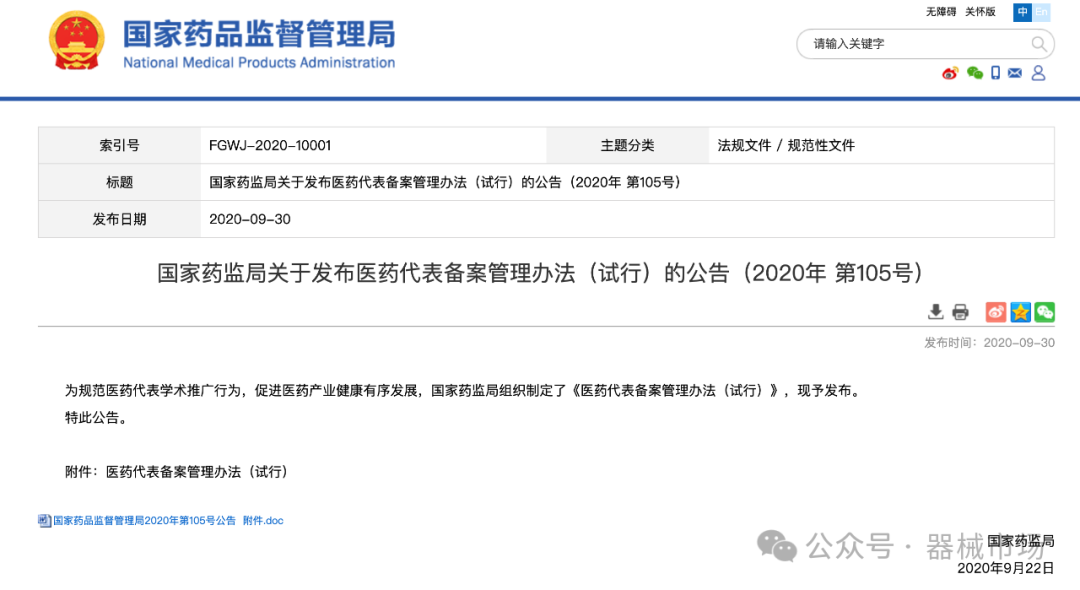 - 海南省药监局发布《关于加强医药代表管理的通知》,进一步落实医药代表备案制,要求各药品上市许可持有人将本企业医药代表备案信息发送至公务邮箱,同时对学术推广行为、药品销售等行为提出规范要求。