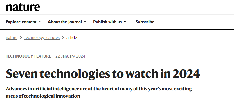 随着步入2024年,科技领域的发展越来越受到各种尖端创新融合的影响。其中,先进的人工智能(AI)技术在多个关键发展领域扮演了核心角色,成为推动变革重要动力。1月22日Nature发文探讨了七项具有定义行业、增强人类能力和应对全球关键挑战潜力的关键技术。