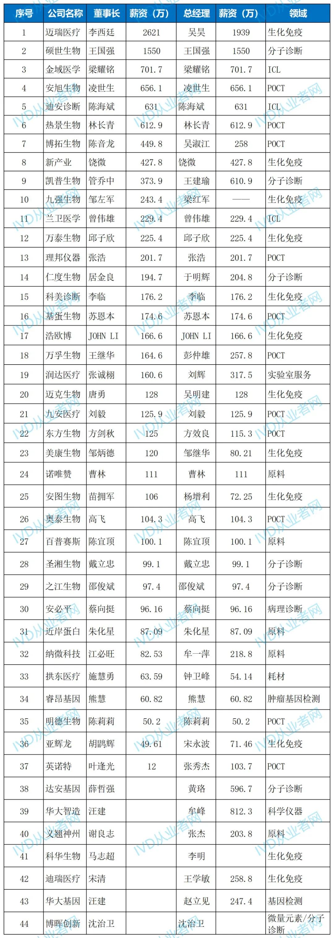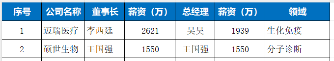 | 随着IVD上市企业越来越多,体外诊断企业的董事长及总经理的年薪也逐渐成为公开是的数据,据企查查数据显示(根据企业纰漏时间差异,从2021-2023不等):迈瑞医疗、硕世生物的董事长及总经理年薪均超过1000万,迈瑞医疗董事长李西廷薪资达到了2621万。  位于第二梯队的是热景生物、金域医学、迪安诊断、安旭生物董事长及总经理的年薪均超过了500万/年第三梯队的则是以博拓生物、凯普生物、新产业、九强生物、兰卫医学、理邦仪器万泰生物等公司,董事长及总经理的年薪在200-500万之间。第四梯队是以仁度生物、科美诊断、基蛋生物、浩欧博、万孚生物、润达医疗、迈克生物、九安医疗等为代表的企业,董事长及总经理的年薪在100-200万之间。 第五梯队则是以圣湘生物、之江生物、安必平、明德生物、亚辉龙等企业,董事长及总经理的年薪在100万以下。