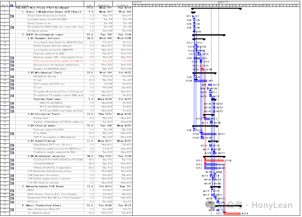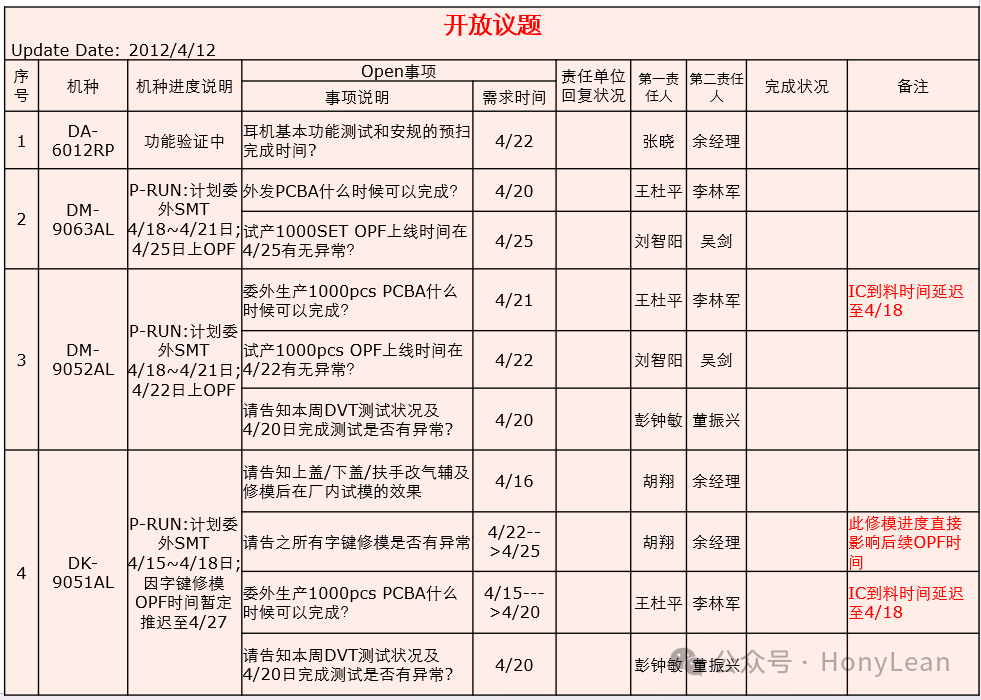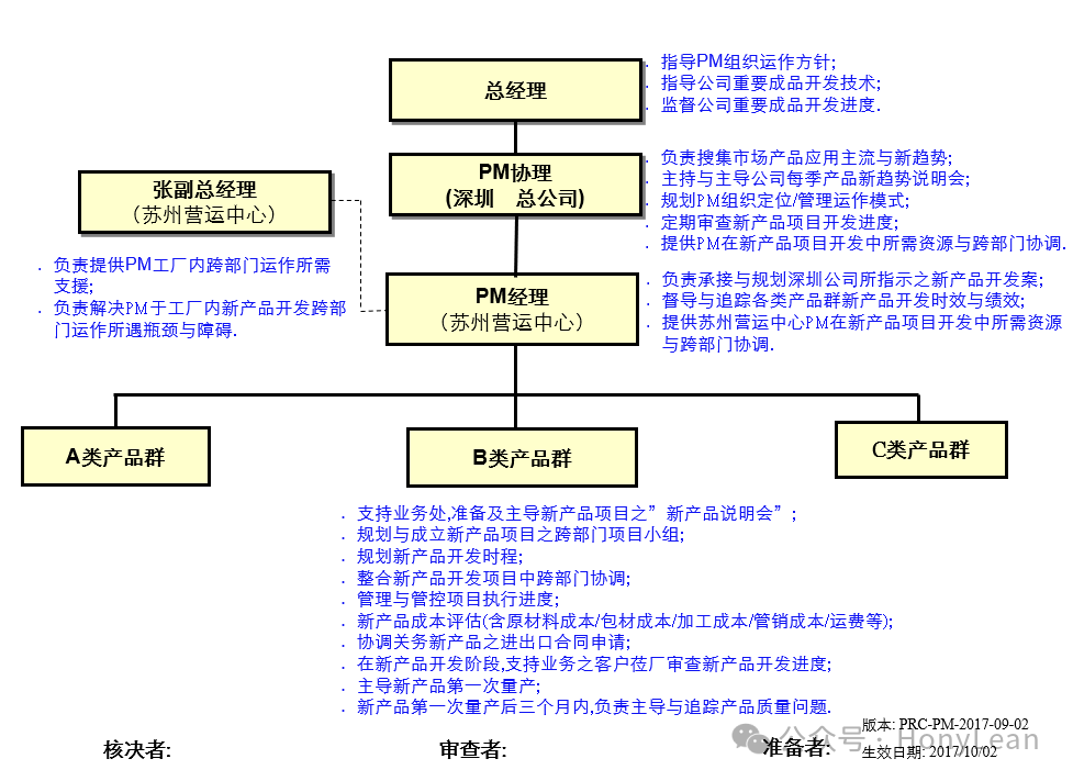 『产品项目整合部』组织与系统(PM, Project Management) 组织定义: 产品项目整合部(PM, Project Management)为一跨区域之新产品开发整合单位.负责规划与整合新产品开发活动中项目小组成立、管控项目执行进度、成本评估、跨部门协调等统合性工作,以确保开发出符合客户需求之产品. 作业范围(起点与终点): 当新产品之基本规格确认后,所有新产品开发活动即由产品项目整合部接手统筹规划与管控,一直到新产品第一次量产后三个月内之质量问题解决.在此新产品开发期间,公司内所有部门必须全力配合产品项目整合部的开发项目进度掌控. PM定期运作模式: (1)每周四下午14:00~16:00PM以视频会议召开区域”新产品项目开发进度审查会”,参与人: 深圳总公司(PM/研发/品保/工程主管)苏州营运中心(张副总/工程、品保、生技、厂务、制造一级主管与参与新产品项目开发各部门核心成员 )其他(若有必要请模具或关键材料厂商代表出席)(2)每周五12:00前,PM将修订过之”新产品开发时段计划表”传给相关人员.(3)重要之新产品项目开发进度若有延误之风险, PM要立即以会议或 E-mail方式告之相关人员.相关信息一定要CC给总经理/张副总. PM组织功能图 PM项目日常管理 PM会议前准备:汇整与发行新产品在开发进程中的[开放议题] ※PM工程师于每周五汇总整理新产品在开发过程中的[开放议题],确定各项议题的第一责任人与第二责任人.并将整理好的[开放议题]资料呈交PM主管审核.PM主管经确认无误后,于下班前以E-mail的方式发行给相关部门高层主管与公司领导.(第一责任人是新产品成员,第二责任人是各部门最高主管) ※发行后的[开放议题]资料要求各部门主管必须于下周星期一10:00前以E-mail的方式回复(为了防止邮件过多,仅回复PM责任工程师即可),以便PM能及时更新资料.否则在星期一下午14:00点的会议中将记录未回复人员的缺失. min) (B)上周PM周会会议记录追踪 (15 PM依[会议记录]中的事项预计完成时间跟进责任人的执行效果与达成状况.于每周一的PM周会前更新完毕上周的[会议记录].在会议中再次Review记录事项的执行效果与达成状况. 备注:※ C-A-P-D ※ 「第二责任人」为参与会议的部门主管‚负政治责任.「第一责任人」为第二责任人指派该部门内部负责实际执行人员. |