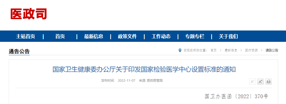 国家卫健委于2022印发《国家检验医学中心设置标准》。