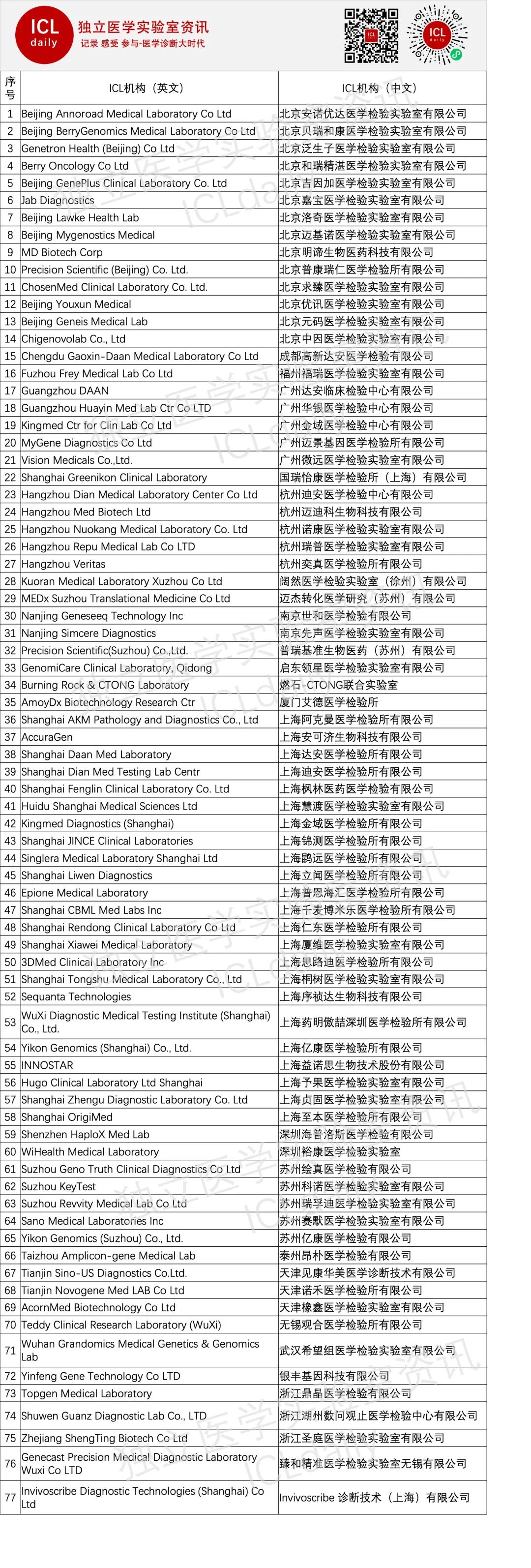 2020年3月独立医学实验室通过CAP全名录,总共31家ICL通过。