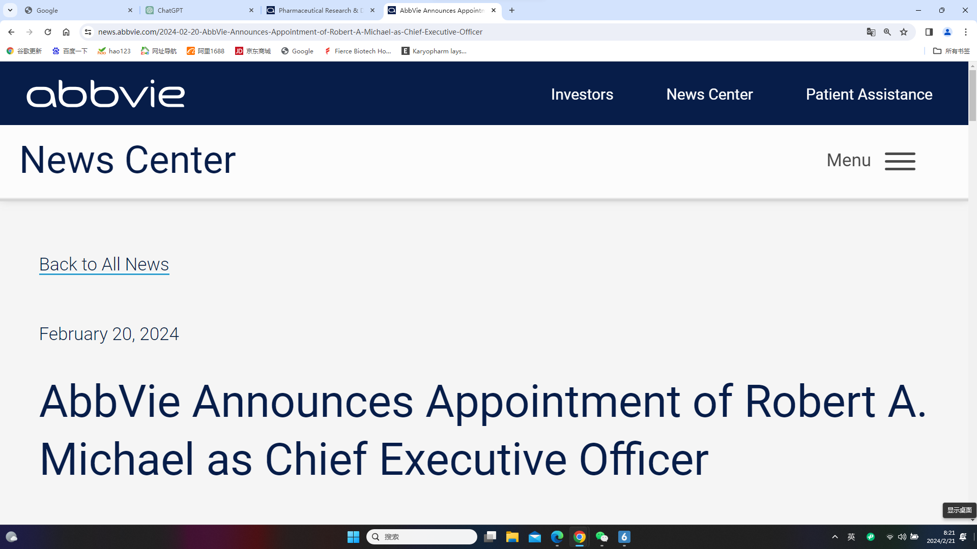 2024年2月20日,艾伯维宣布更换CEO,现任COO Robert A. Michael 将接替Richard A. Gonzalez成为新任CEO,Gonzalez将于2024年7月1日退休,卸任CEO。 新闻稿称公司董事会一致选定现任总裁兼首席运营官Robert A. Michael接替Richard A. Gonzalez担任公司首席执行官(CEO)。自公司成立以来一直担任CEO的Gonzalez先生将于2024年7月1日从CEO职务退休,并担任董事会执行主席。此外,董事会还任命Michael先生为董事会成员,任命将于2024年7月1日生效。 Richard A. Gonzalez自2013年艾伯维从雅培分拆独立运营以来,Richard A. Gonzalez便一直担任CEO至今。在他担任CEO期间,其核心业绩是将艾伯维的市值从最初的540亿美元上涨至如今的3000多亿美元,调整后的摊薄每股收益(EPS)也从2.93美元增长至11.11美元。 Robert A. Michael 信息来源: https://news.abbvie.com/2024-02-20-AbbVie-Announces-Appointment-of-Robert-A-Michael-as-Chief-Executive-Officer |