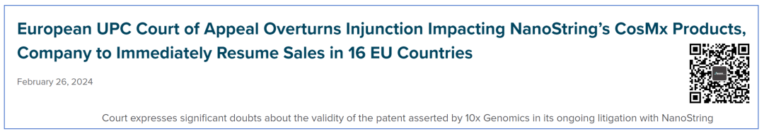 各位亲爱的股东,大家早上好中午好晚上好! 今天,空间生物学的历史性时刻再次出现,我们又一次见证了历史! 2024年2月26日,欧洲专利法院UPC( European Unified Patent )推翻了此前针对NanoString CosMx产品的禁售令! NanoString CosMx产品立即恢复在欧洲16国的销售! 法院认为,10x Genomics此前宣称NanoString侵犯其欧洲专利4108782B1(782专利)有效性存疑,很有可能无法证明其法律上的有效性。 此次判决对17个欧洲国家生效,除了德国。 因为德国还有一个关于2794928 B1 (928专利)的官司没有解除禁令,因为法院让NanoString交付保证金才可以解除禁令,NanoString目前正在评估下一步行动的方案。