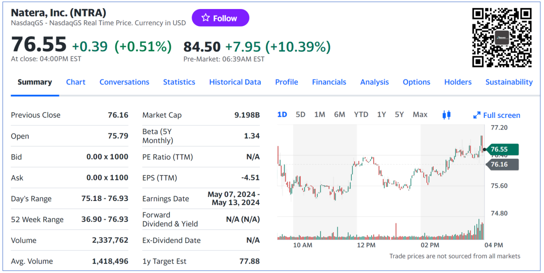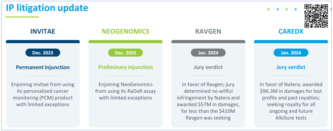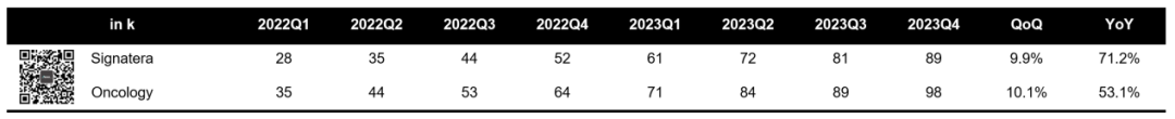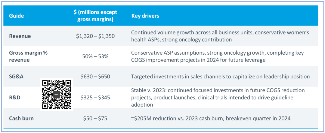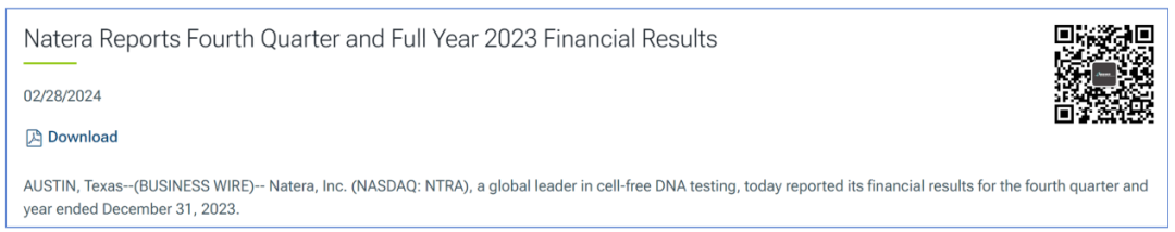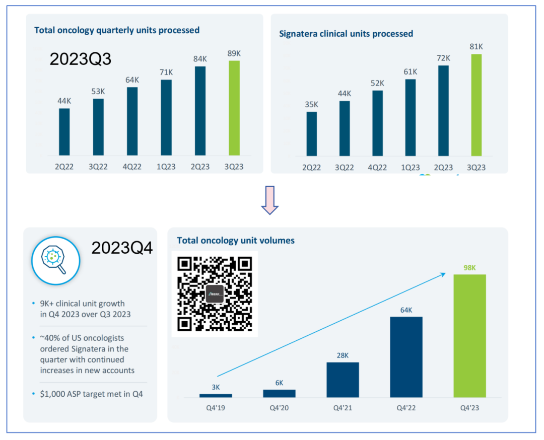 今天,我们将比较全面的分析下Natera 2023Q4的经营状况,并且对2024年Natera的预估做一点分析。 10亿美元俱乐部 2024年2月28日,全球领先的基因检测公司Natera公布了2023Q4以及全年的财务报告。 财报显示,2023Q4营收3.11亿美元,同比增长43%,环比增长16%。 这里面的惊喜点是,2023Q3的环比增长仅为个位数,2023Q2也是个位数环比增长,2023Q4的两位数增长似乎开了一个好头。 另外,我们可以看到2023Q4的净亏损为7803万美元左右,同比减少了4成,环比也有近3成的下降(均根据全年数据推算)。 这带来的显著收益是对现金流消耗的减少,为Natera未来的盈利打下了基础。 2023年全年,Natera营收10.83亿美元,较2022年增长32%。 至此,Natera终于跻身NGS检测公司十亿元营收俱乐部! 相较于Exact Sciences这种大单品IVD的公司,以检测服务为主营的Natera显得尤为不易。 不过,说归说,我们还要对这份财报做个体检,看看含金量怎么样。 财报体检 第一,我们先来看样本量的情况。 样本量维持正增长,环比/同比增速继续下降,但是你别慌。 因为,从营收上来看增速要明显快于样本量的增速。 同时由于肿瘤检测样本量的提升,拉高了客单价。 我们认为,这就是营收增速快于样本量增速的原因。 第二,我们来看看代表MRD的Signatera的情况。 2023Q4 Natera并未公布其MRD产品Singnatera样本量,这可能有两个原因。 1,样本量增长不好看,不如不公布。 2,2022Q4也没公布,常规操作。 这两个推测不知道您倾向哪一边? 都没关系,我们根据此前MRD产品占比大概推测2023Q4其样本量可能在88K-90K左右,我们认为中间值89K是一个最可能的量。 这里插播一句,胖哥认为Singnatera的样本量可能在86K-90K的区间,至于为什么MRD这个量不及预期,要看胖哥的分析。 我们还是采用89K作为推算基础,其环比增长率可能跌破了两位数,大概在9.9%。 同比增长高达71.2%,略低于上个季度的84.1%,不过依然能打。 第三,现金消耗情况。 我们根据Natera烧钱的速度计算,2023Q4大概是3400万美元(去掉2700万预付设备款),出血收敛速度继续加快。 基本上我们可以维持此前Natera将在2024Q2止血的推断。 另外,必须提一句的是,2023Q4毛利率51.4%,高于2022Q4毛利率10个百分点。 全年来看,2023毛利率45.5%,而2022年则为44.4%,都是不错的进步。 对于投资者和业内人士来说,更为重要的是企业对未来发展的预估。 那么,Natera的2024会怎样? 战未来 我们看下Natera对2024年经营状况的一个财务指引。 营收约13.2-13.5亿美元,增长约21.9%-24.7%。 毛利率再提高,达到50%-53%。 关键的烧钱再少5000万-7500万美元,大概比2023年减少2.05亿美元。 Natera估计平衡点出现在2024年,我们预估在2024Q2可能达到。 噢,对了,这个财务指引是个什么水平? 一目了然。 盘前的价格,似乎说明了花街的态度。 在法律上把Invitae打的满地找牙之后,又把这个老对手的生殖业务纳入Natera的版图。 个人觉得,2024年这个营收啊,还是略微保守了一点。 Exact Sciences,是不是也该感到背后一点凉意? 你要敢动MRD,信不信Natera杀进早筛? |