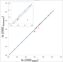 欧盟联合研究中心对胰腺淀粉酶参考物质,进行了互换性的实验。实验方案中,先前对临床样品的选择、参与评估互换性的候选参考物质、以及用哪些常规检测程序进行实验评估等,这些要求在前面几个微信中都已经做了介绍。 本想,因为IFCC工作组的互换性评估方案,对于这个参与互换性评估的这些专家们,是很新颖的。我想他们也正是想确实了解IFCC方案,较美国CLSI的互换性评估方案要好。但是,这篇文章最后的讨论总结,却无法说出究竟哪个方案更好的结论。 欧盟联合研究中心,在为ERM-DA470中铜蓝蛋白丧失了与常规样品间互换性的工作中,已经使用了美国CLSI EP30文件。 图1、2013年欧盟联合研究中心Zeger报告铜蓝蛋白与临床样品间,在多个常规方法检测中互换性的表现。附:图中各个有颜色的为被评估的三个参考物质:红色圆点为1993年制备的ERM-DA470;三角蓝色的为2009年制备的ERM-DA470k;方块绿色的为2010年制备的ERM-DA472。图中的黑线是Deming回归线,黑线上下两条虚线为95%可信水平的预测区间。 图2、α-淀粉酶催化浓度检测,对5个候选RM的互换性评估,按照CLSI C30-A叙述的具有预测区间的线性回归分析。 图1和图2表达的方式相同。评估互换性使用的就是美国CLSI EP30方式。 因此,在EP30的互换性实验方案中,很容易看出,哪个候选参考物质与临床样品在各个检测系统的表现,清楚地说明了问题。