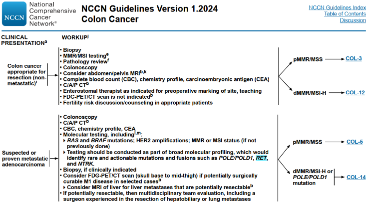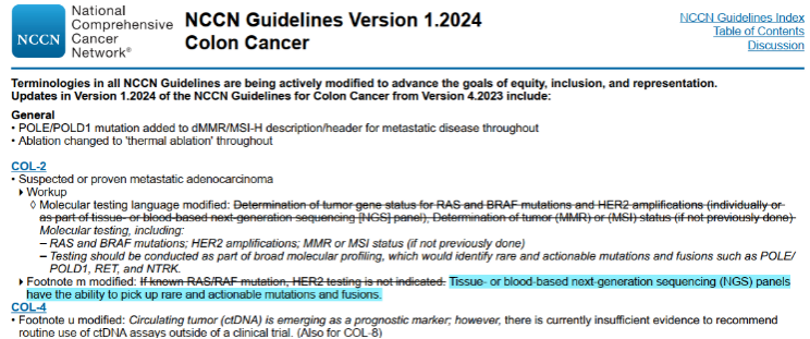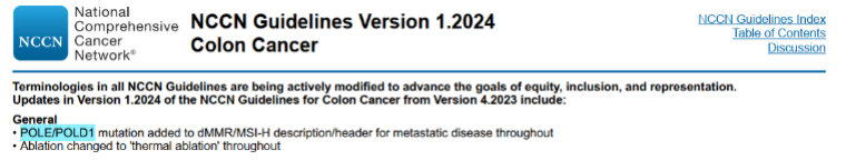 2024年1月29日,美国国家综合癌症网络(NCCN)官网更新了结肠癌及直肠癌2024.V1版临床实践指南。首次增加了POLE 和POLD1突变、RET融合基因的分子检测说明,同时突出NGS的优选地位。