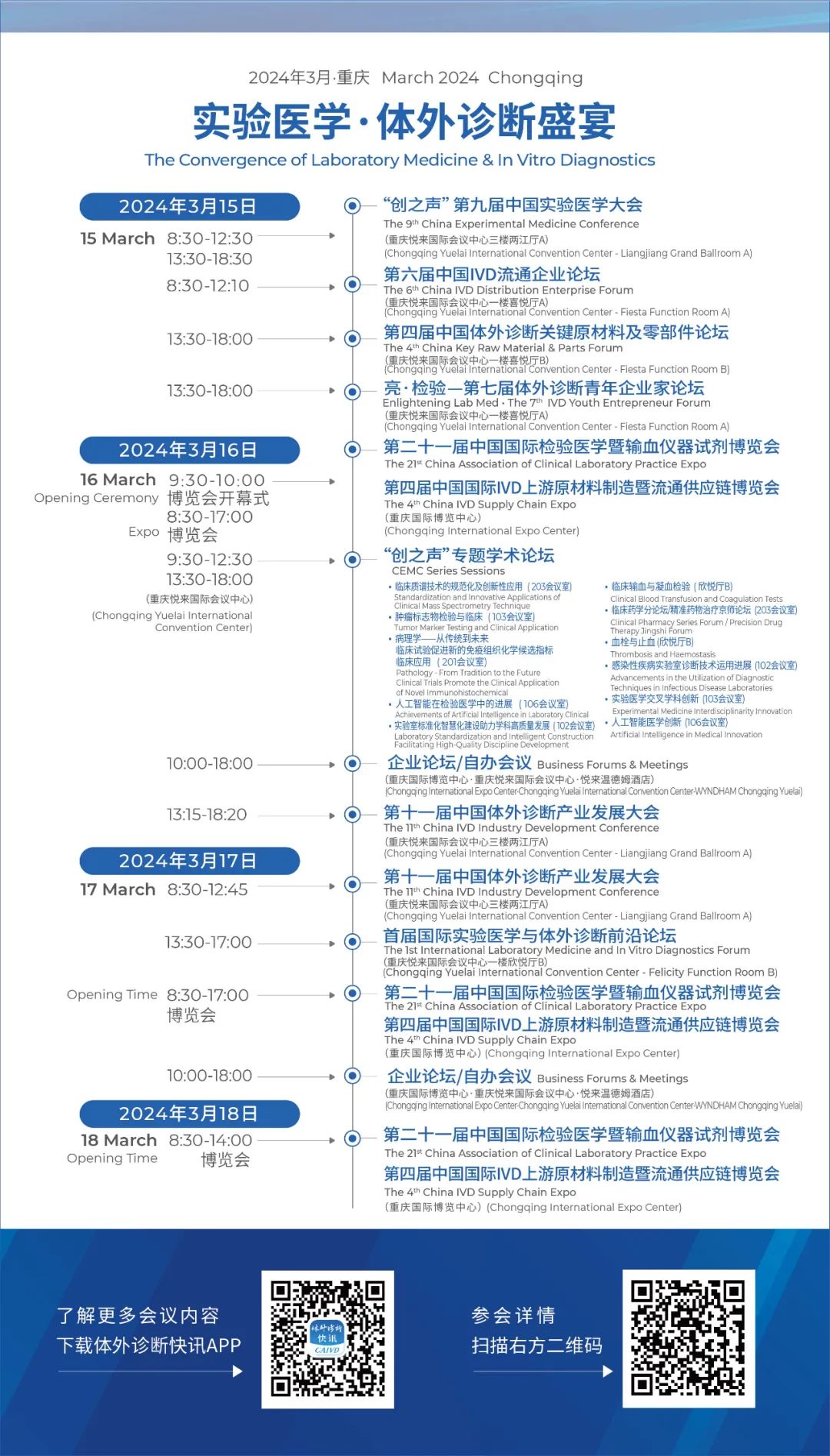 各相关单位: 大会主题 新征程·跃未来 本届大会将聚焦体外诊断行业新风向与新发展,邀请业界知名专家、学者、企业家围绕新形势下如何更有效的构建体外诊断行业健康生态、促进产业良性发展,正确应对各种政策要素带来的机遇与挑战,大会就IVD卫生经济学、创新、医改、集采、行业现状、国际化运营能力建设、投融资、战略重组、企业激励机制建设、最新前沿技术等话题展开全方位、多维度、深层次的报告与分享。每年一届的发展大会内容丰富,信息量大,是IVD全要素、全产业链重要的年度学术盛会。届时“亮· 检验—第七届体外诊断青年企业家论坛”、“第六届中国IVD流通企业论坛”、“第四届中国体外诊断关键原材料及零部件论坛”将同步举行。 中国体外诊断产业发展大会始终坚持以促进体外诊断产业健康发展为己任,致力构建体外诊断产业协同发展的行业交流大平台。我们诚挚地邀请实验医学工作者和关心支持体外诊断产业健康发展的各界同仁及体外诊断产业业界同道们参与本届大会。让我们齐聚山水灵动之城,魅力山城重庆,共享“实验医学·体外诊断”盛宴。 届时,由PCEM主办,CAIVD、上海市实验医学研究院、VIEW 期刊协办的“‘创之声’第九届中国实验医学大会(CEMC)”、CAIVD主办的“亮· 检验—第七届体外诊断青年企业家论坛”、“第六届中国IVD流通企业论坛”、“第四届中国体外诊断关键原材料及零部件论坛”以及由智奥瑞和(上海)展览有限公司主办的第二十一届中国国际检验医学暨输血仪器试剂博览会(简称“CACLP”)、第四届中国国际IVD上游原材料制造暨流通供应链博览会(简称“CISCE”)亦将同步举行。 供稿:小舟 编辑:雪墨 | 校对:甜宝 | 责编:小舟 |