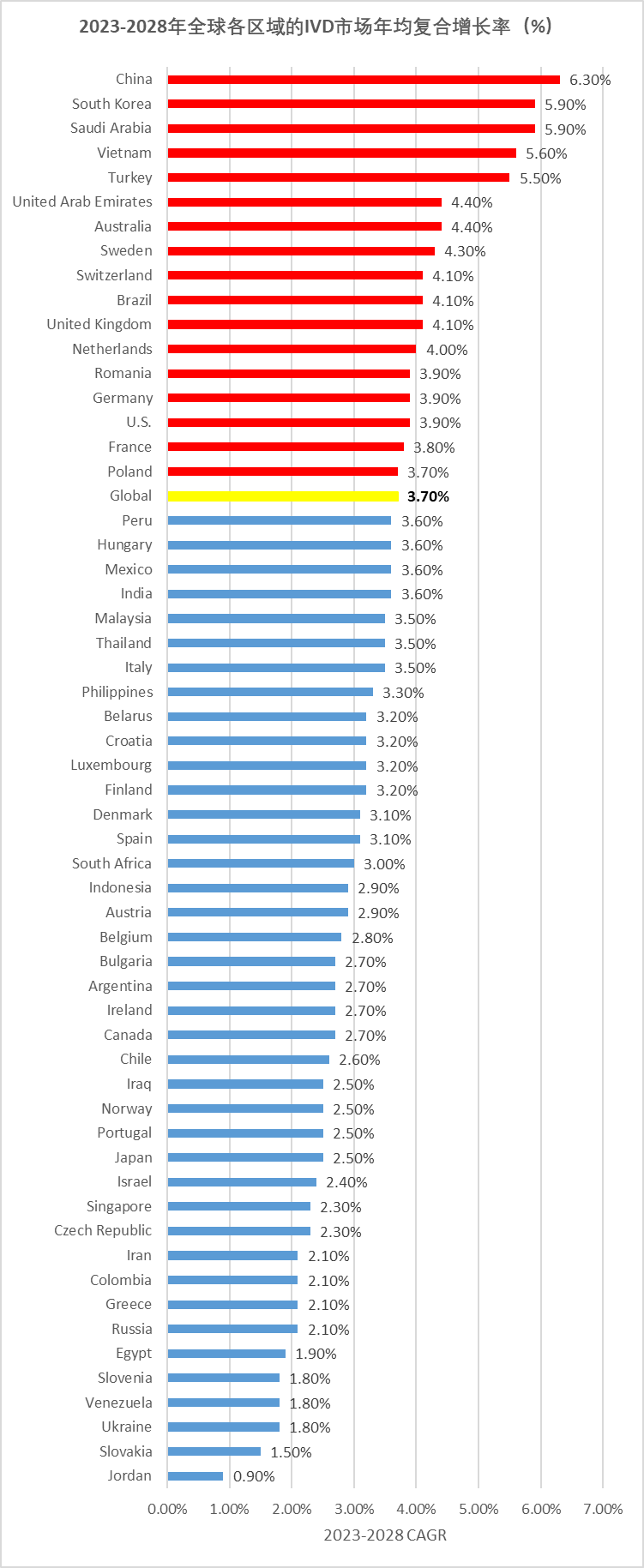 据报告显示,从2023-2028年全球各区域的IVD市场年均复合增长率来看,高于全球IVD市场的3.7%的地区共有17个。中国的年均复合增长率为6.3%,排名最高,韩国和沙特阿拉伯均为5.9%,越南为5.6%,土耳其为5.5%,其它国家的IVD年均增长如下图。