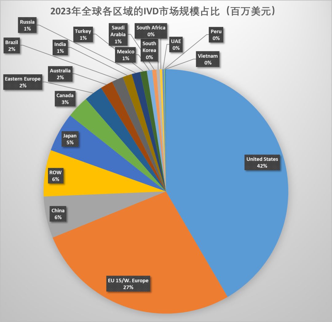 Kalorama Information发布的《The Worldwide Market for In Vitro Diagnostic Tests, 16th Edition 》(2023年8月)报告,2023年全球IVD市场规模最大的依然是美国,约占全球IVD市场规模的42%;欧洲地区约占27%,排第二;中国的IVD市场规模约占6%,排名第三,日本、加拿大次之。