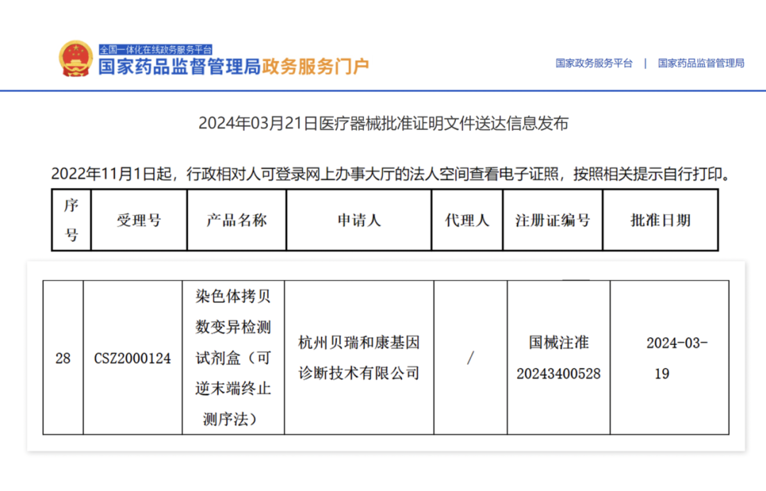 2024年3月21日,贝瑞基因“染色体拷贝数变异检测试剂盒(可逆末端终止测序法)”(国械注准20243400528)获国家药品监督管理局(NMPA)批准上市!据悉,该试剂盒适用于体外定性检测高危孕妇羊水样本,同时检测染色体非整倍体及多个CNV异常情况,可为临床提供全面、精准、高效的产前诊断解决方案!
