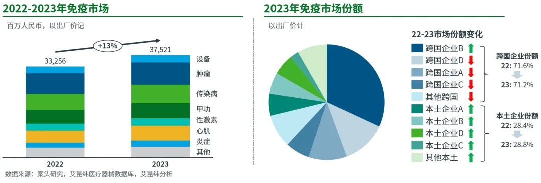 2023年疫情后检测量恢复及心脑血管疾病发病增加,免疫市场增速达13%;跨国企业目前仍占市场主导,整体份额变化较小
