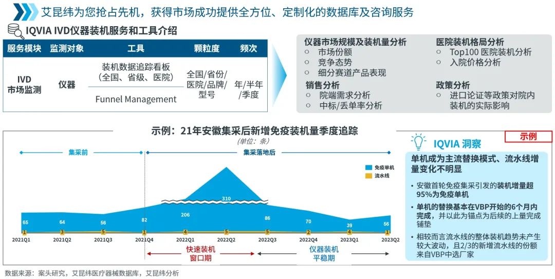艾昆纬IVD数据库囊括近3000家终端用户,包含生化、免疫、分子诊断等核心品类的仪器装机数据。以其专业性、可靠性、及时性为您的精准业务决策助力。艾昆纬新增季度仪器装机数据库,也将帮助企业更快更准地捕捉政策影响及集采前后IVD市场变化带来的机遇和挑战。通过多维度筛选新产品及技术,全面助力企业探索新产品组合机会,获取全新增长点。