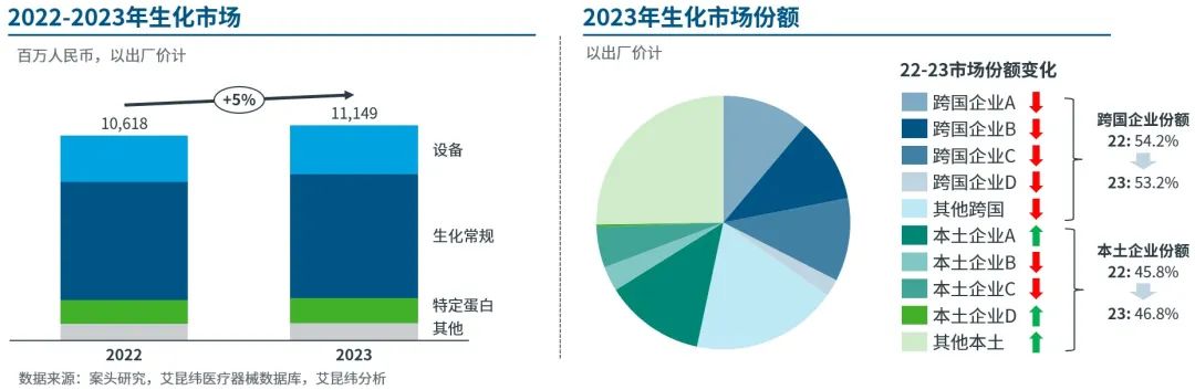 2022-2023年生化市场维持稳定增幅约5%;国产替代趋势明显,本土企业份额预计随集采深化进一步增加