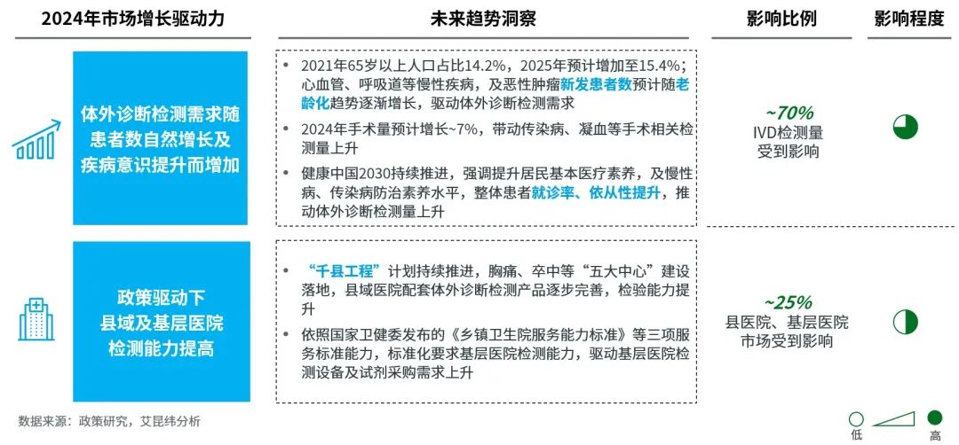 2024年体外诊断市场核心驱动因素来自老龄化趋势和疾病意识提升所带来的患者增长,以及县级、基层医院在政策驱动下对于检测试剂/设备采购需求的上升。