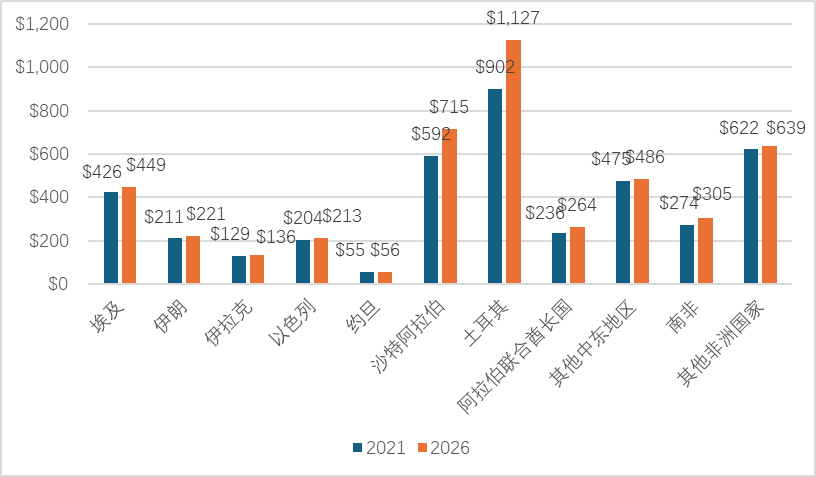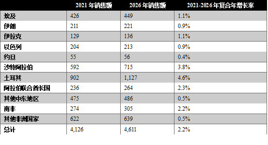 由于国民收入增加,中东和非洲地区的生活水平不断提高。这导至心脏病——高血压、高胆固醇和高血糖的发病率上升。据世界卫生组织称,中东/非洲地区是心脏病高发地区之一,这促使更多的人入院治疗。表2.1 | 2021-2026年中东/非洲各国体外诊断销售额(单位:百万美元)图2.1 | 2021-2026年中东/非洲各国体外诊断销售额——八个国家创造了近75%的市场价值2021年,其他中东和非洲市场的市场价值为10.97亿美元。例如,2020年11月,Roche宣布在科威特成立正式法人实体,以扩大当地诊断业务和足迹。这一扩张表明了Roche对中东和非洲地区的承诺,预计将在该地区进行更多的诊断投资。发展中国家的专科医生较少,更多的服务依赖于初级保健医生。发展中国家的医生密度普遍低于发达国家,人口老龄化是发展中国家和发达国家都面临的问题——这给医疗系统带来了压力,使其无法为日益脆弱的人口提供健康服务。衡量这种压力的一个常用指标是老年人供养率,计算方法是15至64岁工作年龄人口数除以65岁或以上人口数。这个比率可以作为一个粗略的指标,用来衡量每个潜在的老年受扶养人所需的潜在扶养人数量(包括医疗费用)。1950年,世界上每个老年人对应12个劳动适龄人口。到2010年,这一比例下降到9,其中下降幅度最大的是较发达国家。到2021年,这一比例将进一步下降到每个65岁或以上的老人对应不到7个工作年龄人口。目前,在许多发展中国家,主要是撒哈拉以南非洲和中东地区,这一比例徘徊在10到15之间。然而,随着全球人口的老龄化,预计全世界的这一比率将下降。未来十年,世界上一半以上国家的老年人赡养比率将低于5。这意味着许多发展中国家开始计划应对人口结构变化带来的老年人护理负担。预计到2030年,以巴西为首的拉丁美洲中产阶级将从1.81亿人增至3.13亿人。在非洲和中东,中产阶级预计将翻一番多,从1.37亿增至3.41亿。根据联合国和经济合作与发展组织(OECD)的数据,中产阶级成员的收入差别很大,从每天赚10美元的人到每天赚100美元或更多的人。这使他们有足够的可支配收入投资于家用电子产品和汽车等消费品,也使他们有能力购买医疗保险或成为医疗保健俱乐部的成员。表2.2 | 2010年和2050年中东及其他选择性国家的老年赡养率来源:World Bank; UN Population Division, World Population Prospects: The 2010 Revision (2011);using Constant-fertility variant 表2.3 | 2010-2030年世界人口:中东和非洲地区主要国家(单位:百万人)来源:U.S.Census Bureau, International Database 图2.2 | 中东和非洲地区各国人口密度,2022年估计值本文摘自《中东和非洲IVD市场研究报告(2022)》