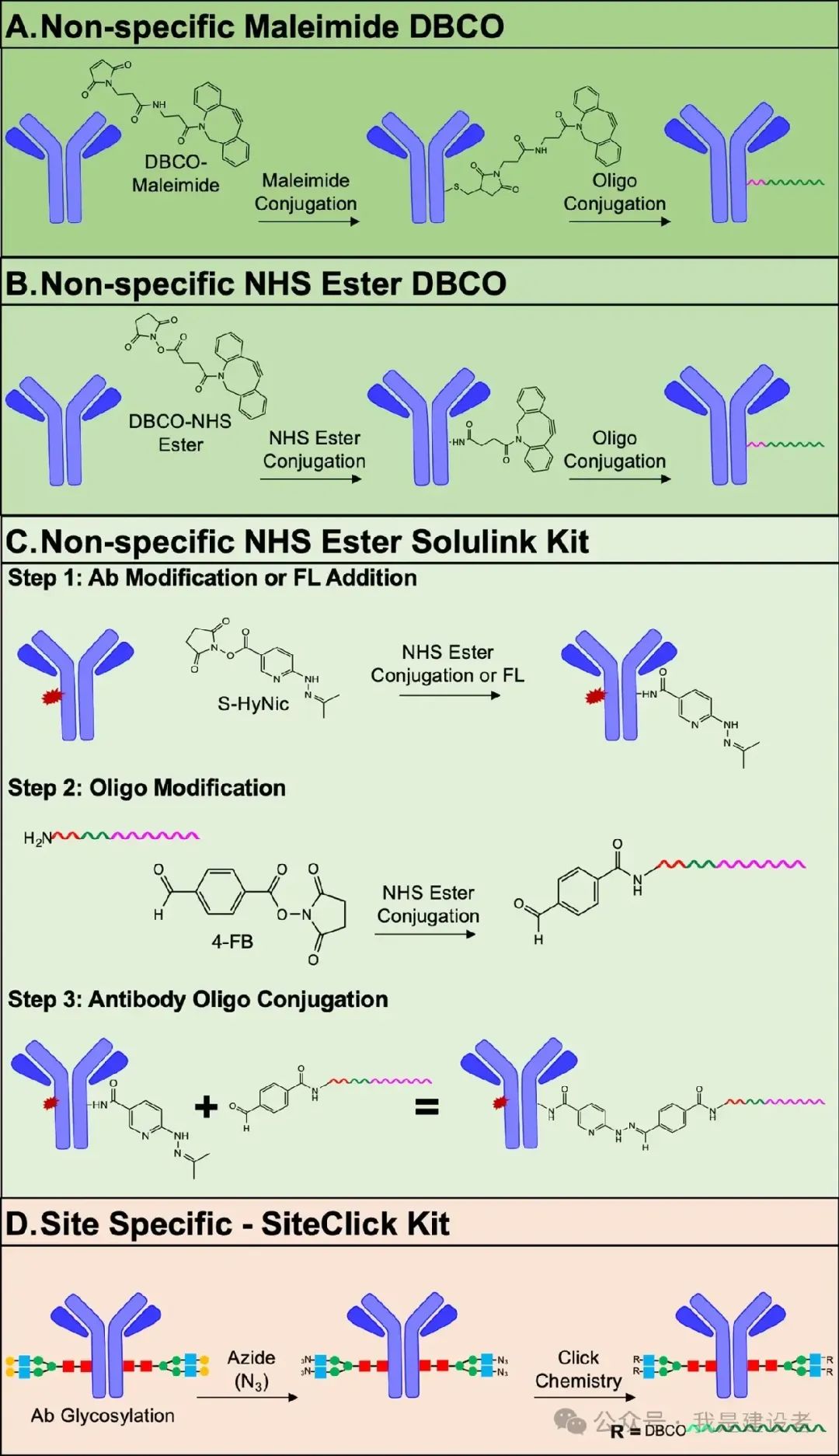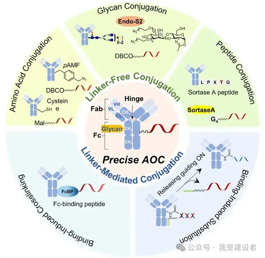 如果你关注免疫诊断、蛋白组学技术的发展(不管是单细胞还是群体或是空间),你就会发现抗体偶联寡核苷酸(Antibody-Oligonucleotide Conjugates, AOC)越来越多地被用到。如果你关注新型治疗形式,那么在抗体偶联药物ADC之后很热的一个方向就是抗体偶联寡核苷酸AOC的成药形式。 AOC用于各种单细胞Assay Immuno PCR Assay Proximity Ligation Assay Ab-oligo偶联物或者称AOC已经被用于从诊断到治疗的很多方面。 AOC最初是为了满足精确有效检测低丰度蛋白质的未满足需求而开发的,在免疫PCR、邻近连接分析PLA、多重免疫测定如Olink基于PEA开发的产品、单细胞多组学特如CITE-seq等检测,以及DNA-PAINT分子成像等领域广泛应用。这些本质上都依赖于抗体的靶标识别特性和核酸的扩增特性。 参考:Olink: 基于亲和力+NGS测序的蛋白组学 // Alamar: 紧随Olink的步伐,这家华人创办的蛋白组学公司 a, AOC小核酸药物;b, PLA;c, DNA Paint 除了生物分析外,AOC还因其通过表面受体介导的内吞作用将包括siRNA、ASO和CpG等在内的遗传治疗有效载荷递送到靶细胞中的潜力而受到极大关注。国内外有多家公司在开发AOC的治疗药物。 理论上,抗体+Linker+寡核苷酸即AOC,其分子量相对较大,在中性和碱性环境下带负电荷、极性大、水溶性强。 抗体因为具有多个官能团,因此可以使用多种缀合化学物质,轻松地与寡核苷酸偶联。 比如,抗体有多个氨基NH2,其作为赖氨酸 (K/Lys)侧链ε-胺和 N 末端 α-氨基分布在各处,其次被常用语进行偶联。除了胺基之外,谷氨酸和天冬氨酸残基以及羧酸 (-COOH) 残基也可以通过其C末端进行偶联。然而,抗体表面分布着大量胺基和羧基官能团,这意味着所用的偶联方法可能会由于结合位点附近缀合残基的空间位阻而导至AOC对靶标失活或亲和力降低。 抗体含有以二硫键 (S-S) 桥形式存在的氧化硫氢基(-SH),这有助于形成抗体的三级结构。Ab-oligo也可以通过巯基进行缀合反应,但这些二硫桥必须先通过还原剂(例如2-ME / SDS)还原以暴露其反应基团。 半胱氨酸和谷氨酰胺因此成为位点特异性偶联的两种常用氨基酸位点。而另一种实现位点特异性偶联的方法是将含有反应性基团的非天然氨基酸(如叠氮基、乙酰基)引入抗体中。与天然氨基酸偶联相比,非天然氨基酸偶联更稳定、更有效,然而,抗体工程也相对繁琐。 逐渐开发的另一种定点偶联的方法发生在抗体的多聚糖链上,这些碳水化合物残基主要出现在 Fc 区,距离抗原结合位点较远,不易受到空间位阻的影响。聚糖偶联,确定连接的有效载荷寡核苷酸的数量和位置也相对简单。 以上这些都是无连接子偶联,由于直接利用了抗体自身的官能团,可能会影响到天然抗体的性能。所以连接子介导的偶联方法被开发,引入连接分子来交联靶抗体和有效的oligo载荷。 可用的交联化学物质包括硫醇马来酰亚胺、NHS-酯、戊二醛、或者是通过点击化学来实现。 与无连接子的偶联相比,连接子介导的偶联可以更好地控制有效载荷的数量和位点特异性,而无需对抗体进行设计。 以前,用于将寡核苷酸与抗体连接的标准化学和方法既困难又耗时,并且需要化学修饰技术的专业科学知识。如今,已经开发出简单、高效和高产的技术,可以快速、轻松地制备AOC。市面上甚至出现了相应的试剂盒用于用户自主生成AOC。 由于最终的应用场景和实验目的不同,对于AOC偶联反应的终产物要求也不尽相同。但总体上来讲,不同的场景都希望AOC终产物有更精准更一致的OAR值(寡核苷酸与抗体比率,oligonucleotide-to-antibody ratio)或称DoC(偶联程度Degree of Conjugation),因此在进行偶联反应后,需要经过纯化去除未偶联物、多聚体、降解片段等多种副产物。高分辨率离子交换是较为常见的层析方式用于偶联反应后AOC的纯化。 往前看,AOC偶联反应及生产的效率、成本、可及性,以及更精准的定点偶联方式、更一致等OAR值等方面的需求会更加突出。此外,抗体提供及寡核苷酸合成服务都越来越可及,随着科研、检测分析及治疗开发等不同场景的需求越来越明确,AOC制备的灵活性、可扩展性、便利性等要求也至关重要。 作为一种新型生产资料,AOC的发展现在可能依然在婴幼期。 你觉得这里有什么机会吗?欢迎留言。 |