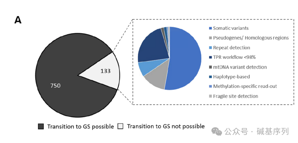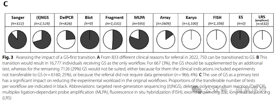 本中心的模型显示,750/883(85%)的转诊可以通过GS检测完成,68%被转诊的患者可以通过单一工作流程和单一实验完成,仅3%需要额外检测,表明对于71%的个体(n=17,444),GS检测优先策略是有益的。有15%的患者不适用于GS,大多数这些患者需要通过核型分析,FISH和/或阵列来检测体细胞结构变异,或者变异位于复杂的基因组区域,这类变异可以通过基于扩增子的长读长测序策略进行评估。