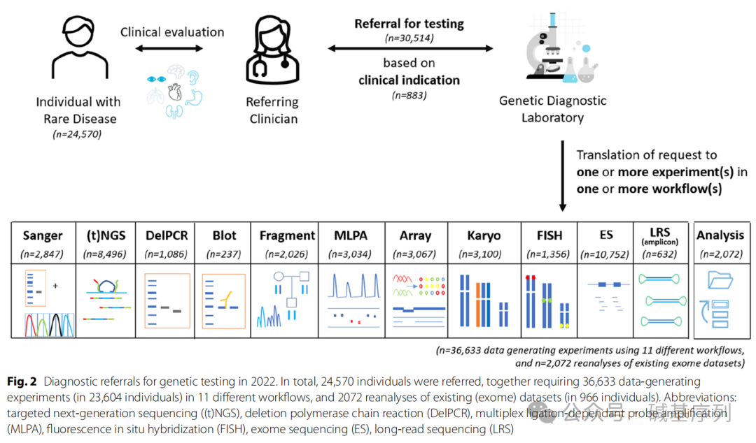 2022年,三级遗传诊断中心共收到30,514例转诊,鉴定24,570名罕见病患者的原发性生殖系DNA变异,共记录了883种不同的转诊原因,其中排名前十的临床指征占所有转诊总数的21%。平均每个患者有1.24次转诊记录,其中82%的患者仅有一次转诊。特别指出的是,对966名患者(2072次转诊)的外显子组测序数据进行重新分析。另外28,442次转诊则通过11种不同的检测工作流程进行了36,633次的湿实验室操作。