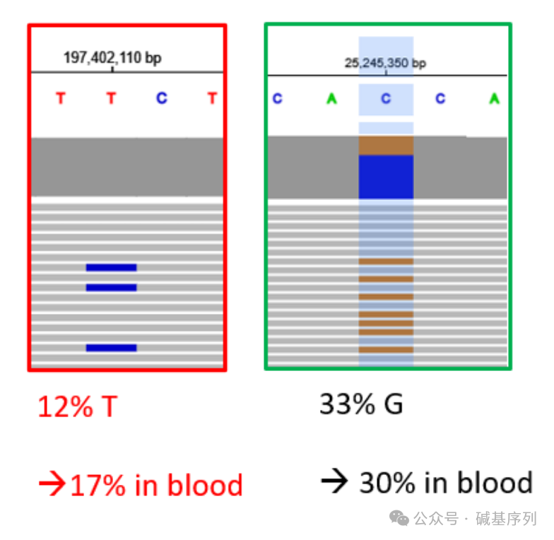 例如:KRAS基因的嵌合性变异【Chr12(GRCh38):g.25245350C>G】最初是通过靶向NGS方法在血液样本中检出,其比例为30%;GS的VCF文件能够提示,且比为15/46(33%)。