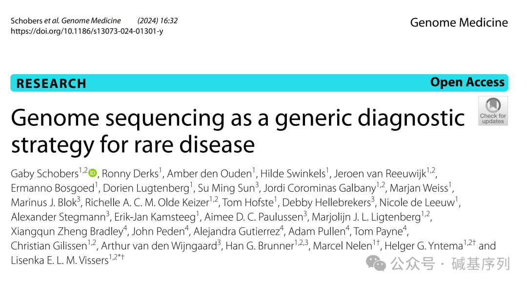 Genome sequencing as a generic diagnostic strategy for rare disease》发表于《Genome Medicine》杂志2024年第16卷第32篇,由Gaby Schobers等人撰写。文章的核心内容是对基因组测序(genome sequencing, GS)作为一种通用的罕见病诊断策略的评估。研究目的是确定GS是否可以替代现有的不同类型的检测手段用于罕见病诊断。